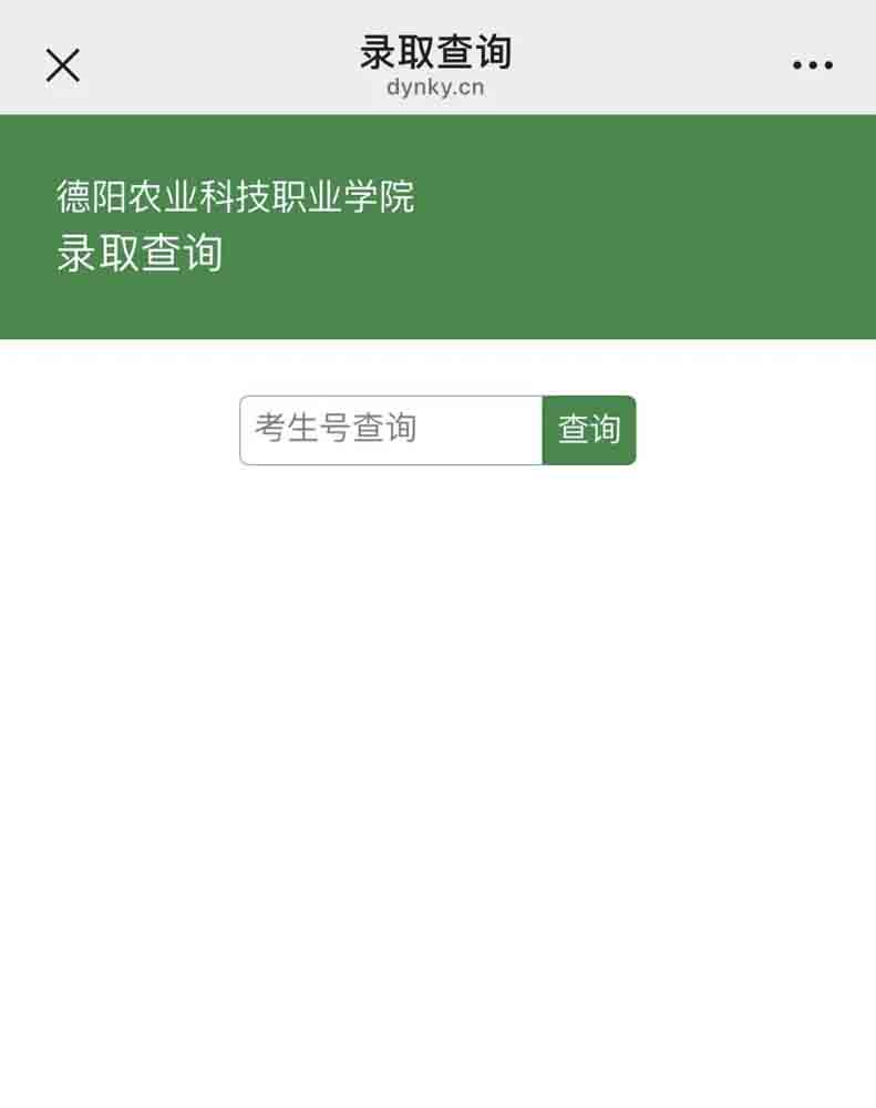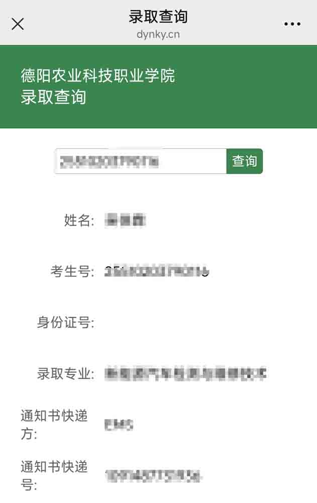 关注“德阳农业科技职业学院”微信公众号,点击下方菜单“掌上农科”后再点击“录取查询”,即可查询录取信息。