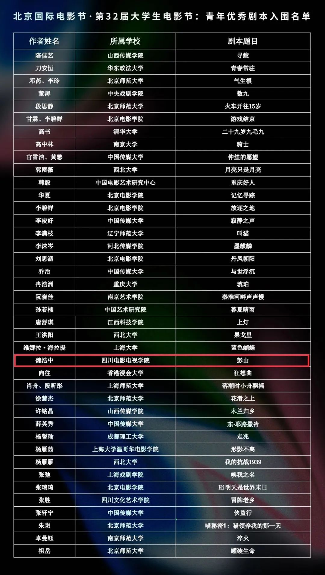 电影学院21级戏文1班 魏浩中同学的作品《彭山》成功入围!