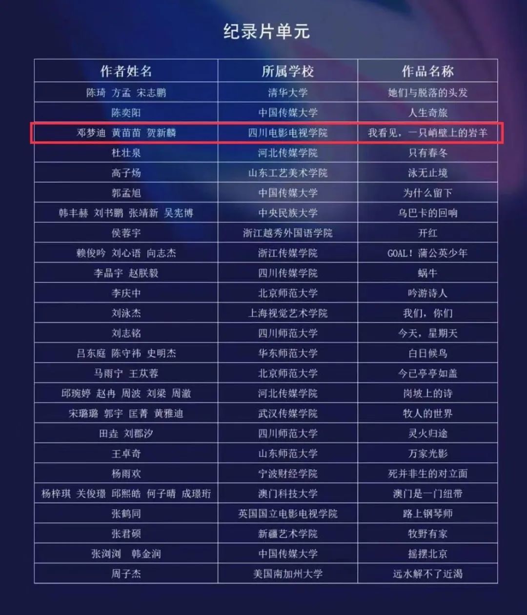 电影学院邓梦迪、黄苗苗、贺新麟同学的作品《我看见,一只峭壁上的岩羊》,成功入围!