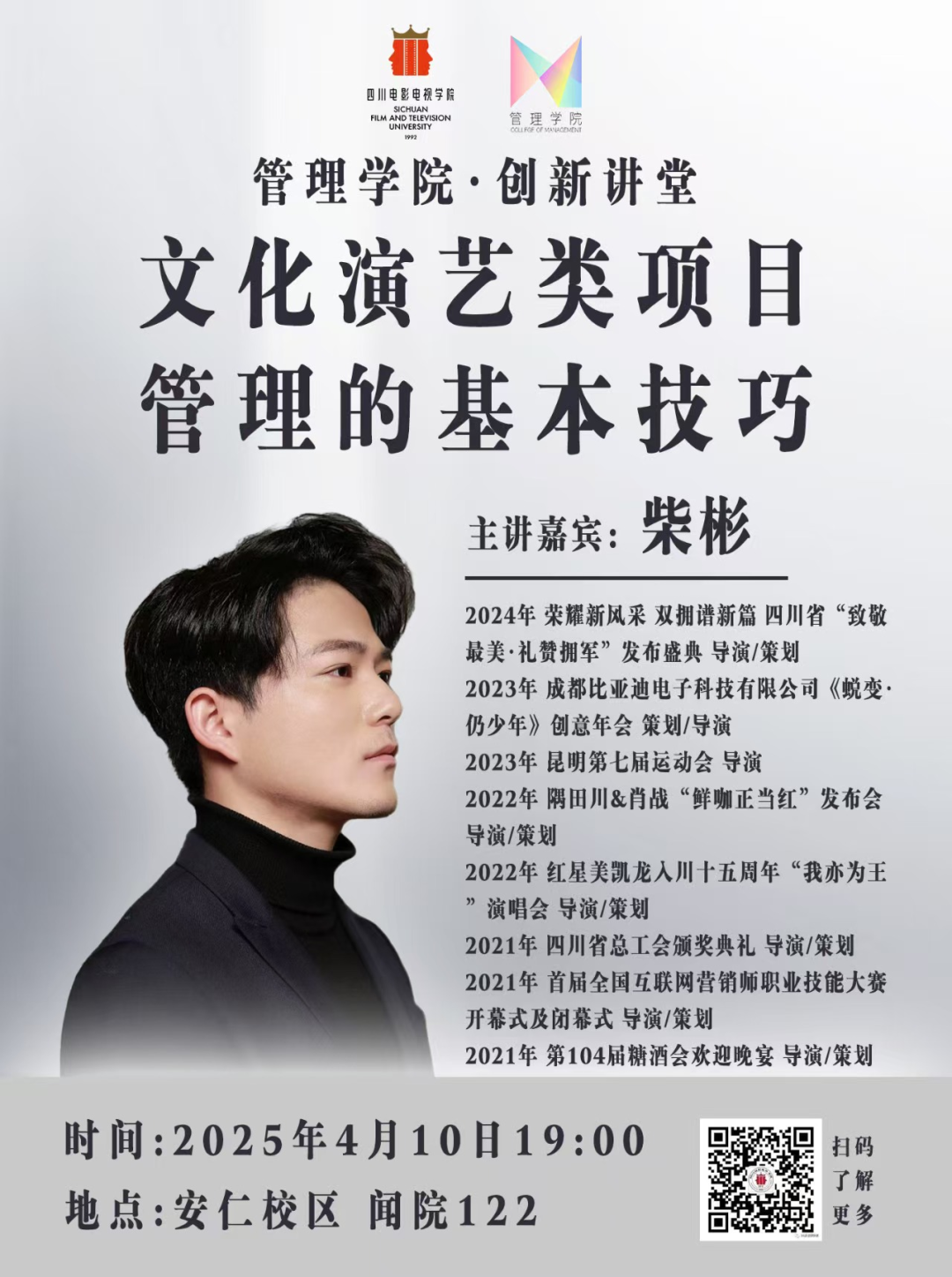 管理学院第七届创新人才培养班创新讲堂于2025年4月10日晚上19:00在闻院122开展。本次课程由本次课程由学院2017级优秀毕业生、2024年四川省“致敬最美*礼赞拥军”发布盛典导演/策划、四川省电影电视学院首批外聘实践导师柴彬为大家讲述《文化演艺类项目管理的基本技巧》出席本次课程的还有管理学院副院长黄娟教授,创新班班主任陆通源老师和创新班全体成员。