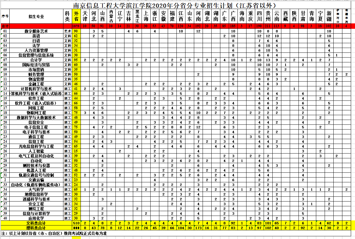 2020年滨江学院全国分省分专业计划(江苏省以外)