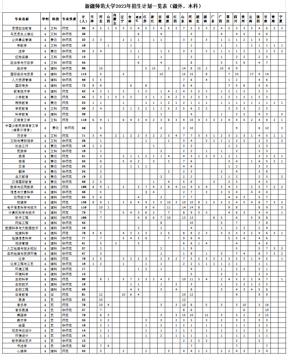 新疆师范大学2023年招生计划一览表(疆外,本科)