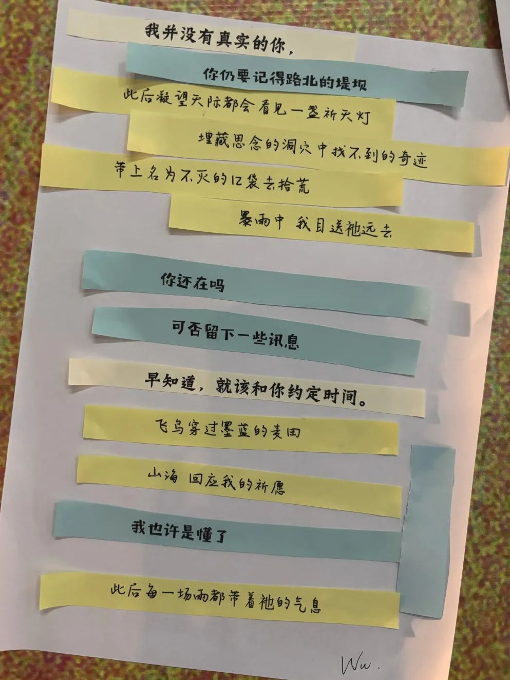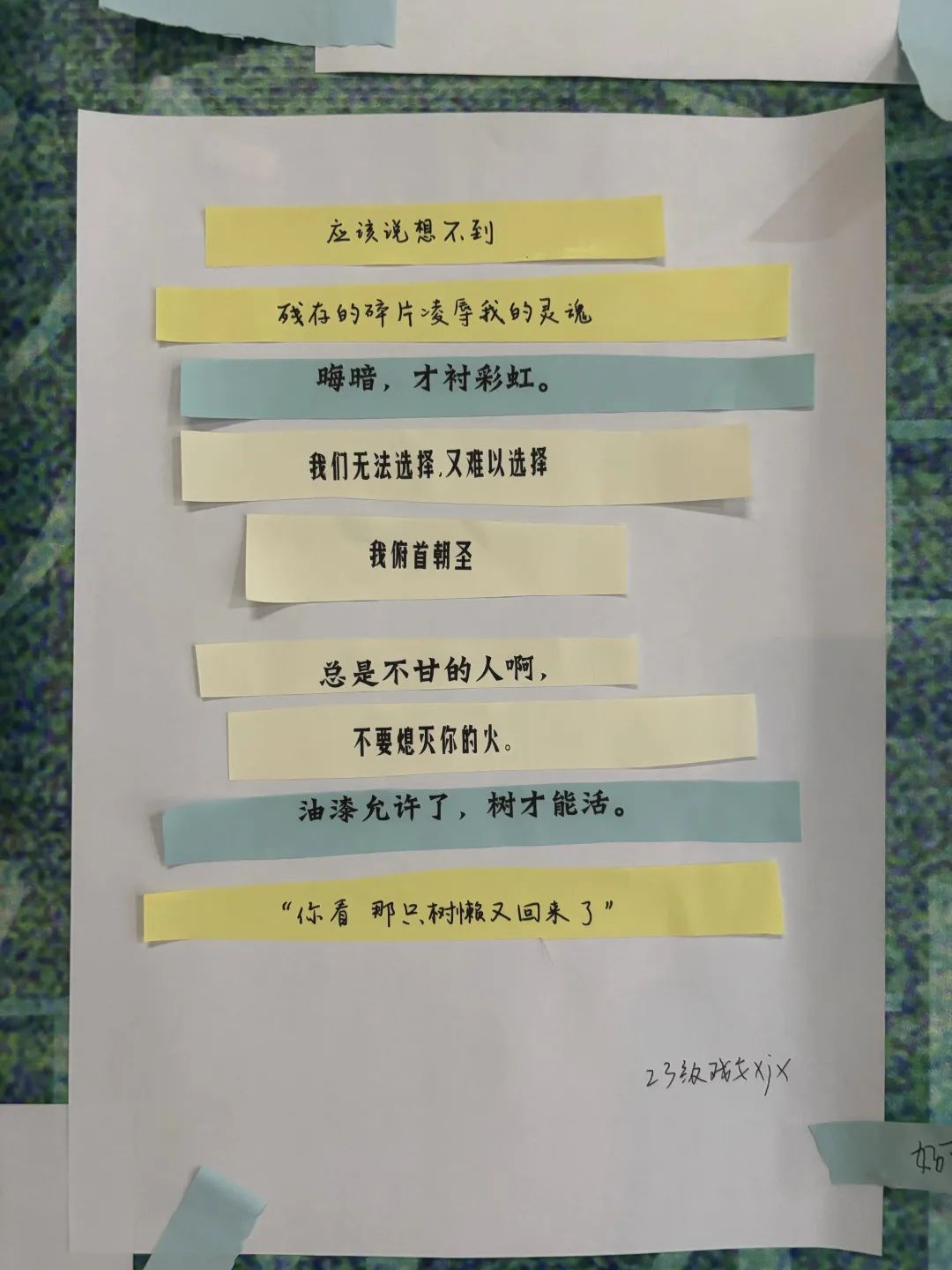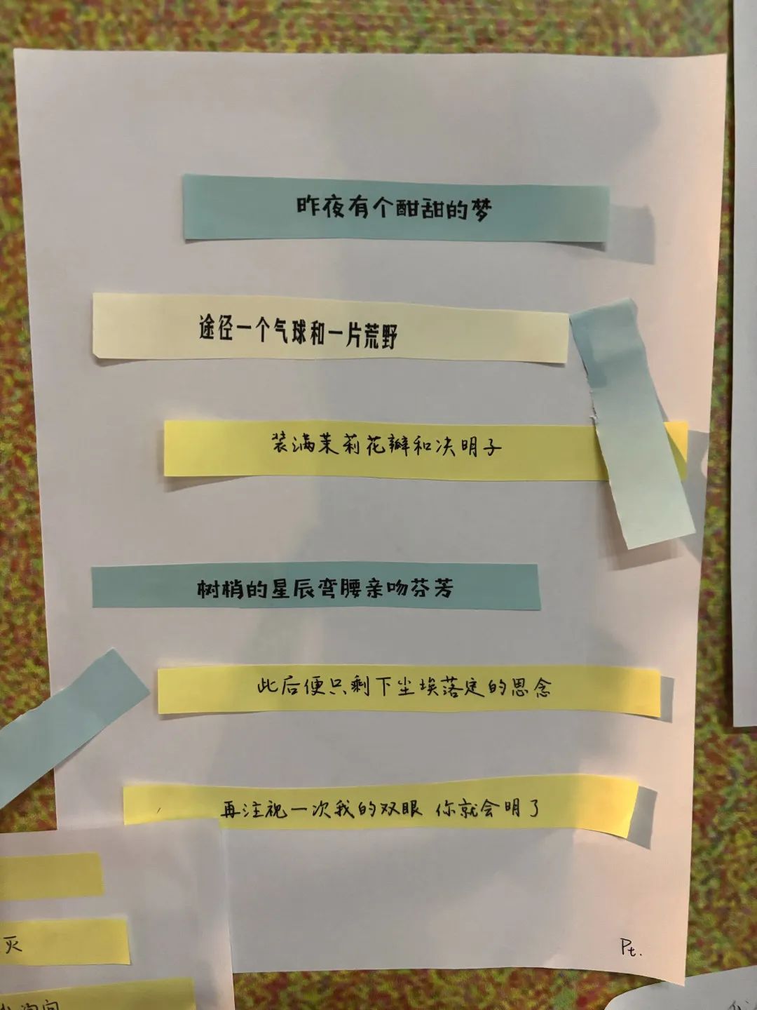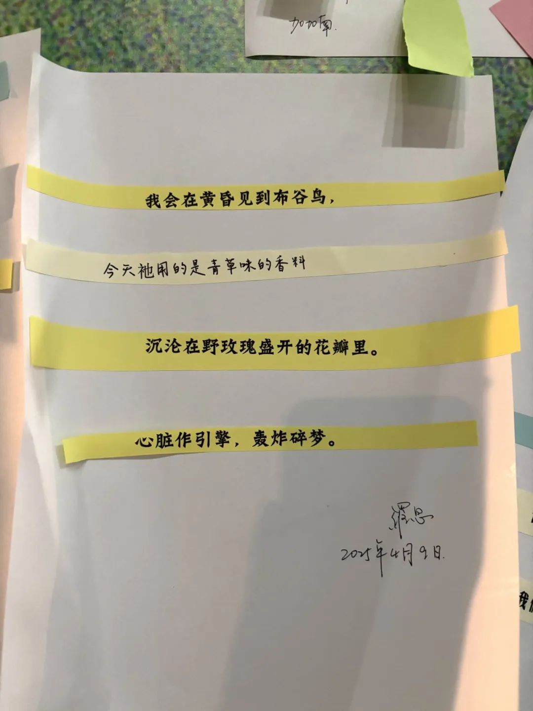 本次活动我们也准备了数量繁多的句子、词语,在活动中大家把这些句子和词语随意裁剪、拼贴,形成新的表达,用胶水粘在一张A4纸上,张贴在我们的活动展览区。