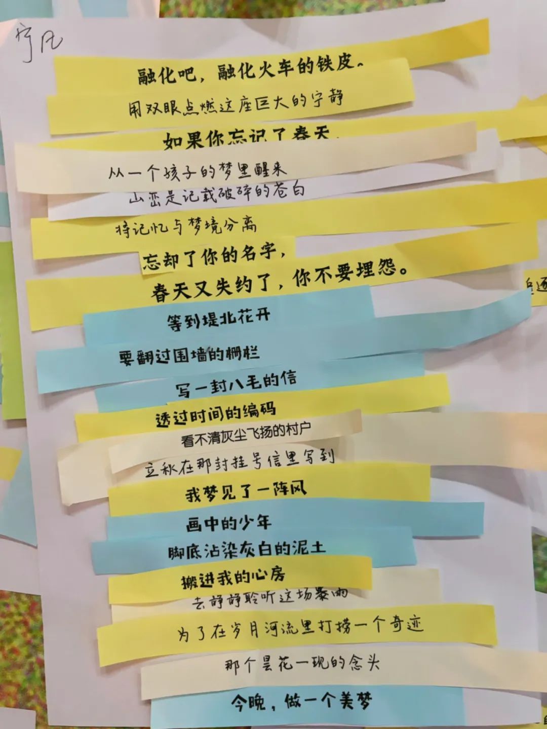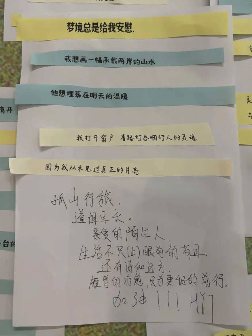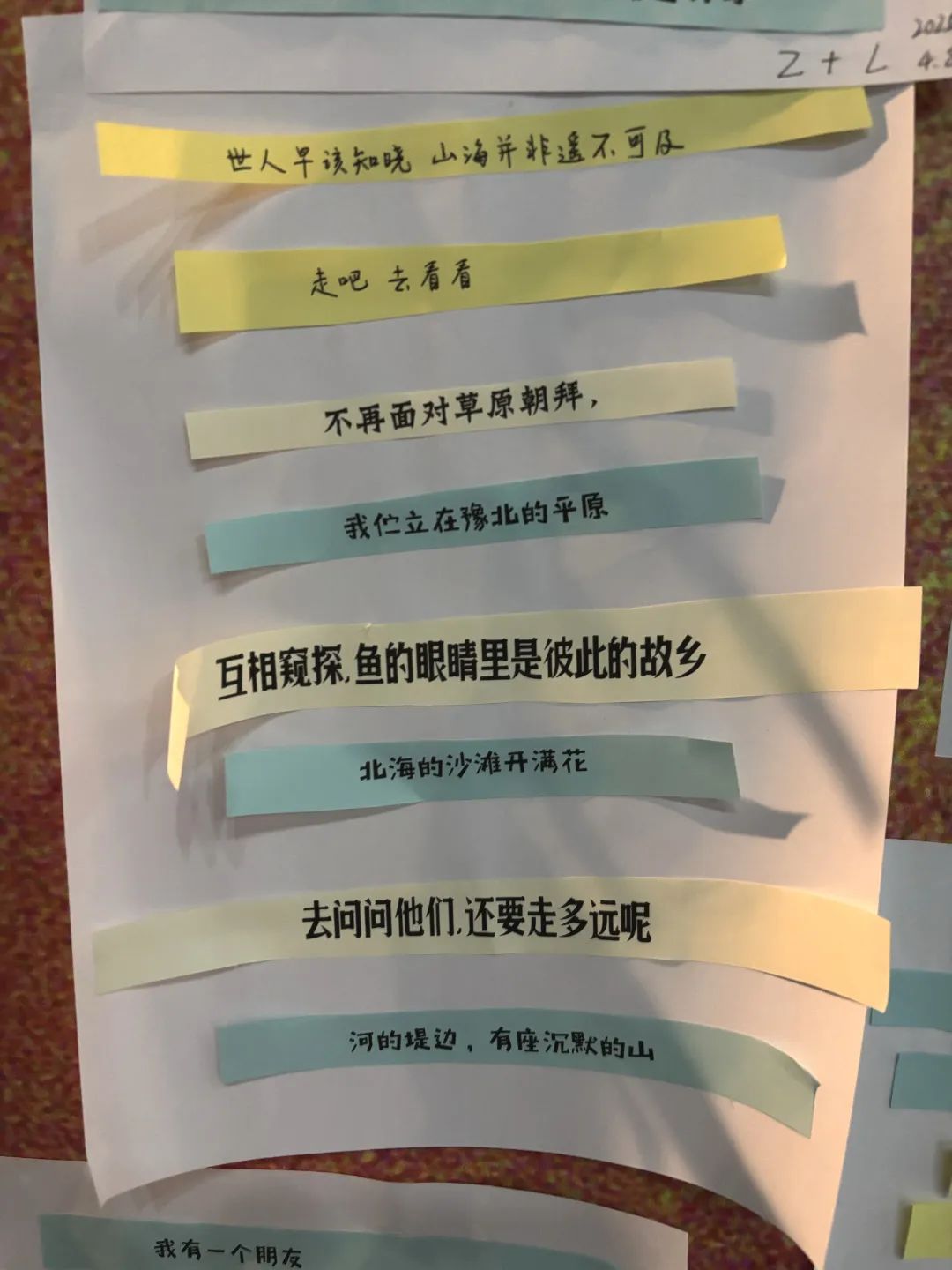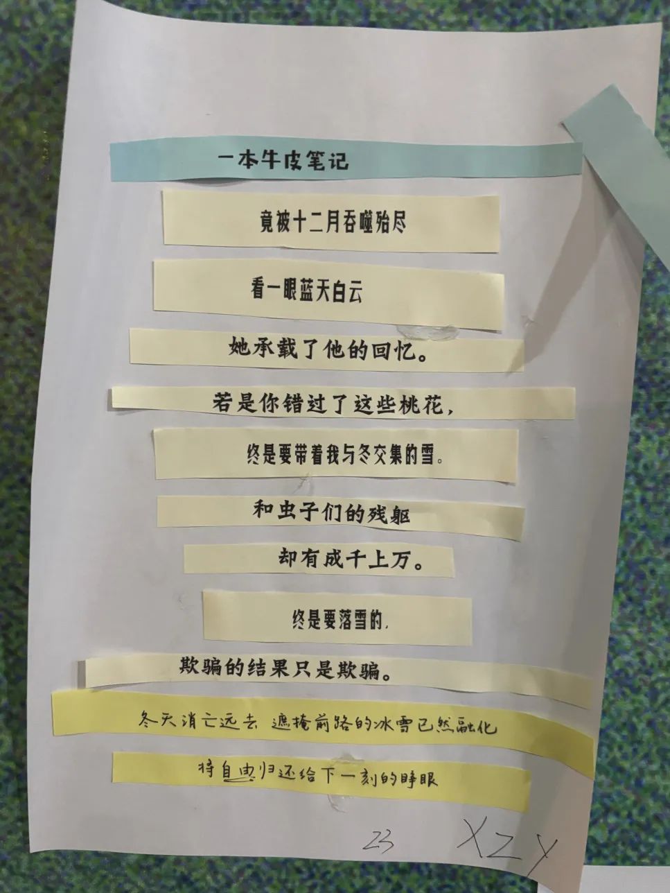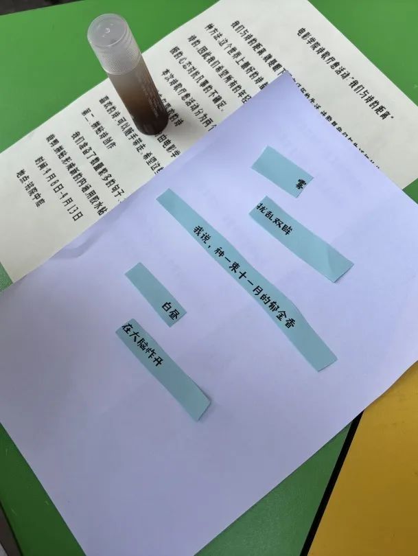 本次活动我们也准备了数量繁多的句子、词语,在活动中大家把这些句子和词语随意裁剪、拼贴,形成新的表达,用胶水粘在一张A4纸上,张贴在我们的活动展览区。
