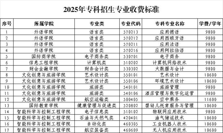 山东外国语职业技术大学2025年专科招生专业收费标准