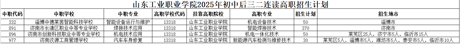 山东工业职业学院2025年初中后三二连读高职招生计划