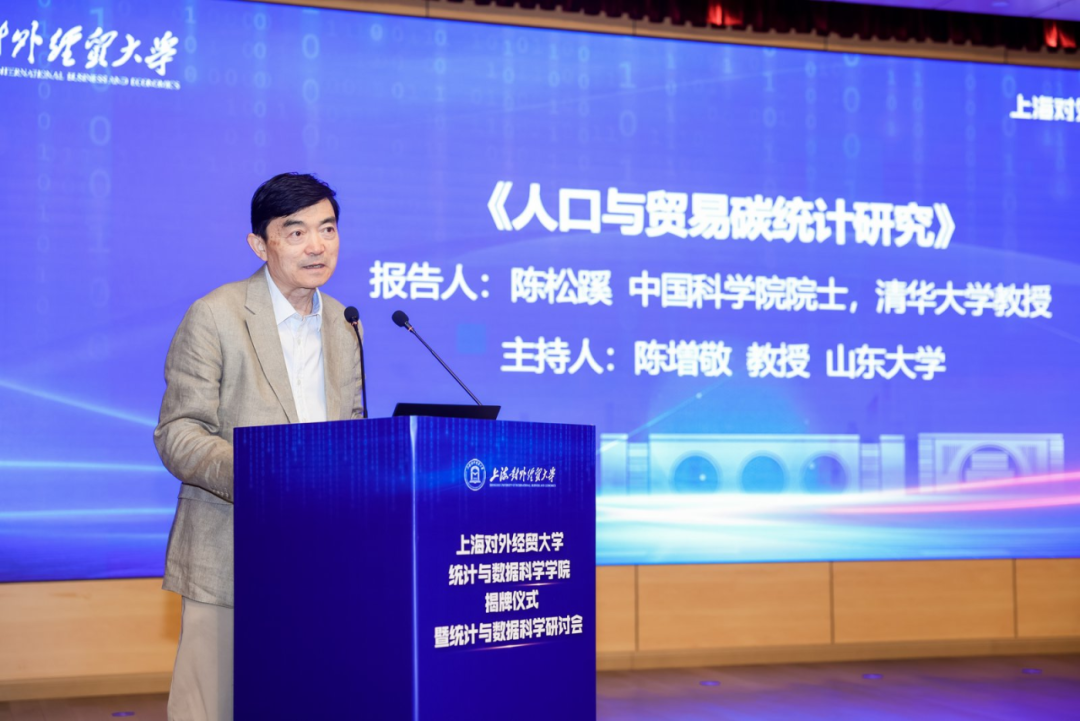 揭牌仪式后,陈松蹊院士、林华珍教授分别作了题为《人口与贸易碳统计研究》《Generative Adversarial Learning with Optimal Input Dimension and Its Adaptive Generator Architecture》的大会主旨报告。
