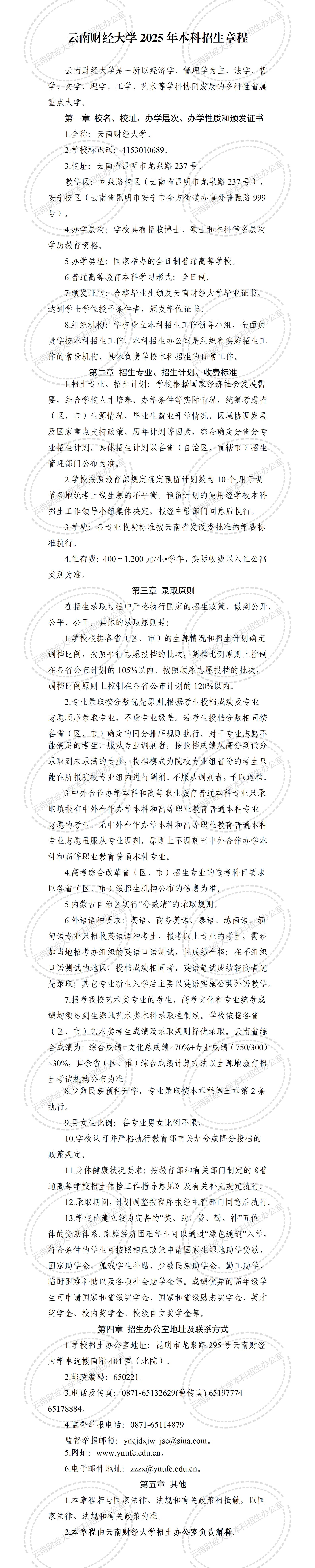 云南财经大学2025年本科招生章程