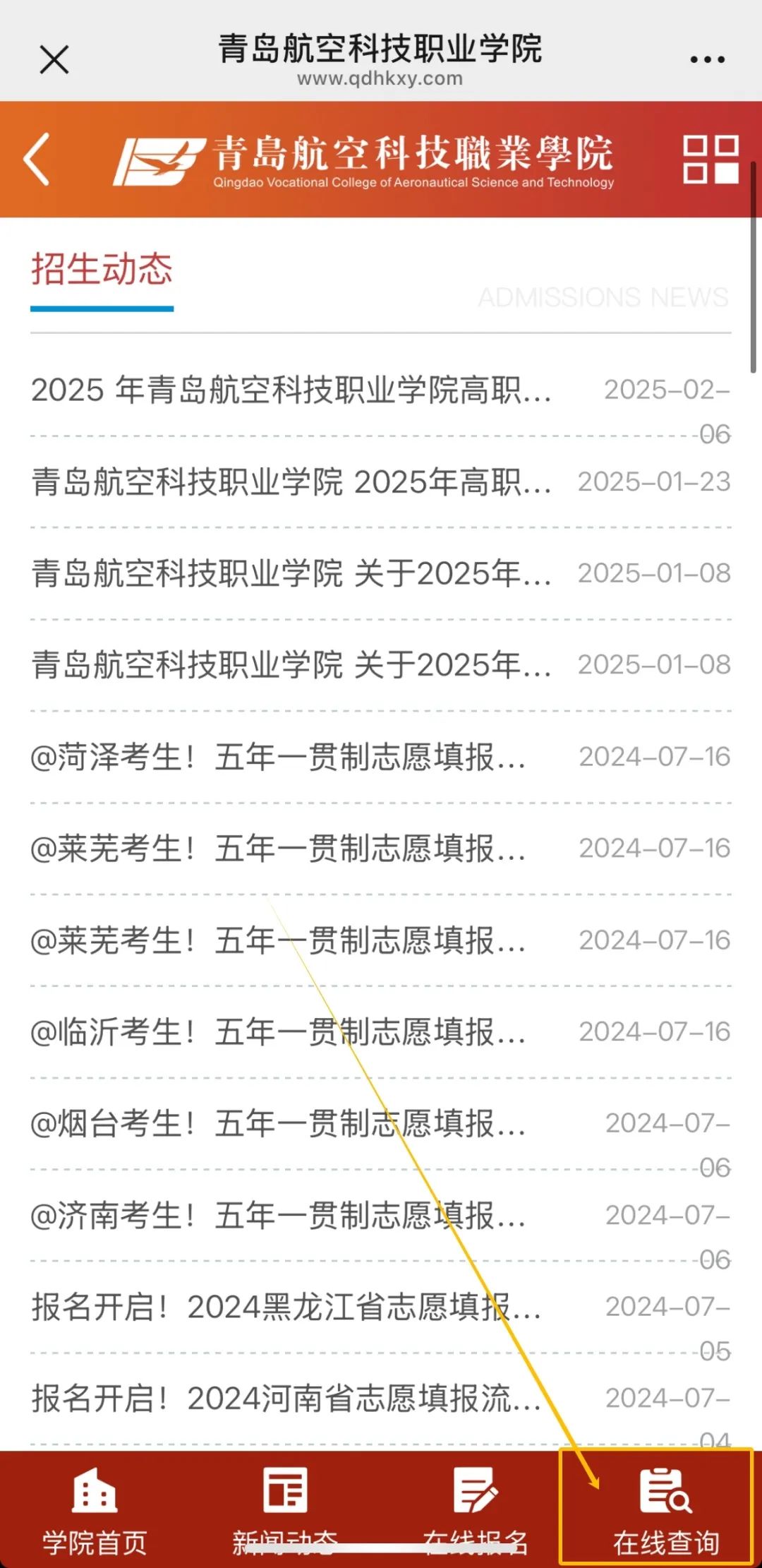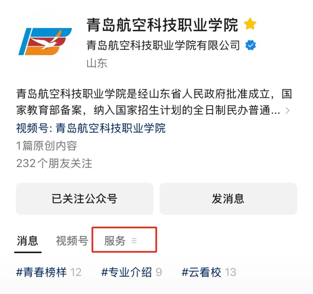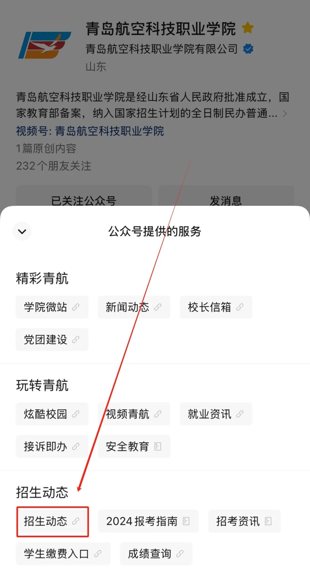 微信搜索“青岛航空科技职业学院”公众号,点击标题栏右侧“服务”,在下拉栏中选择“招生动态”进入查询界面;