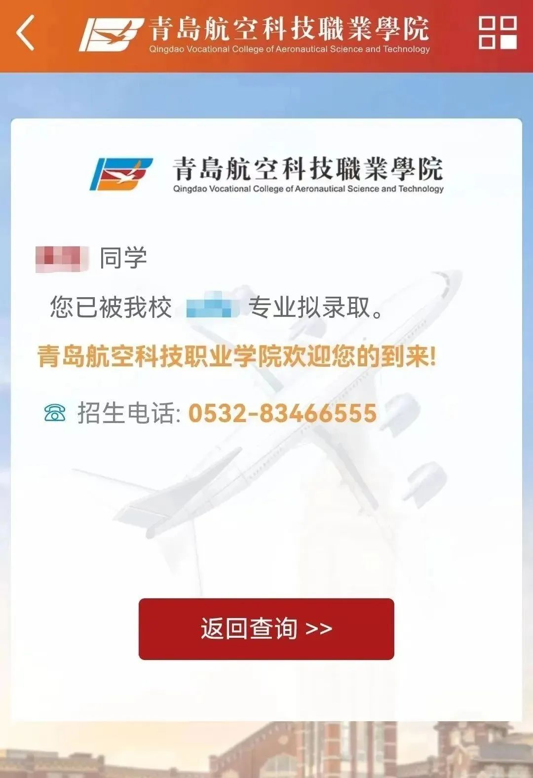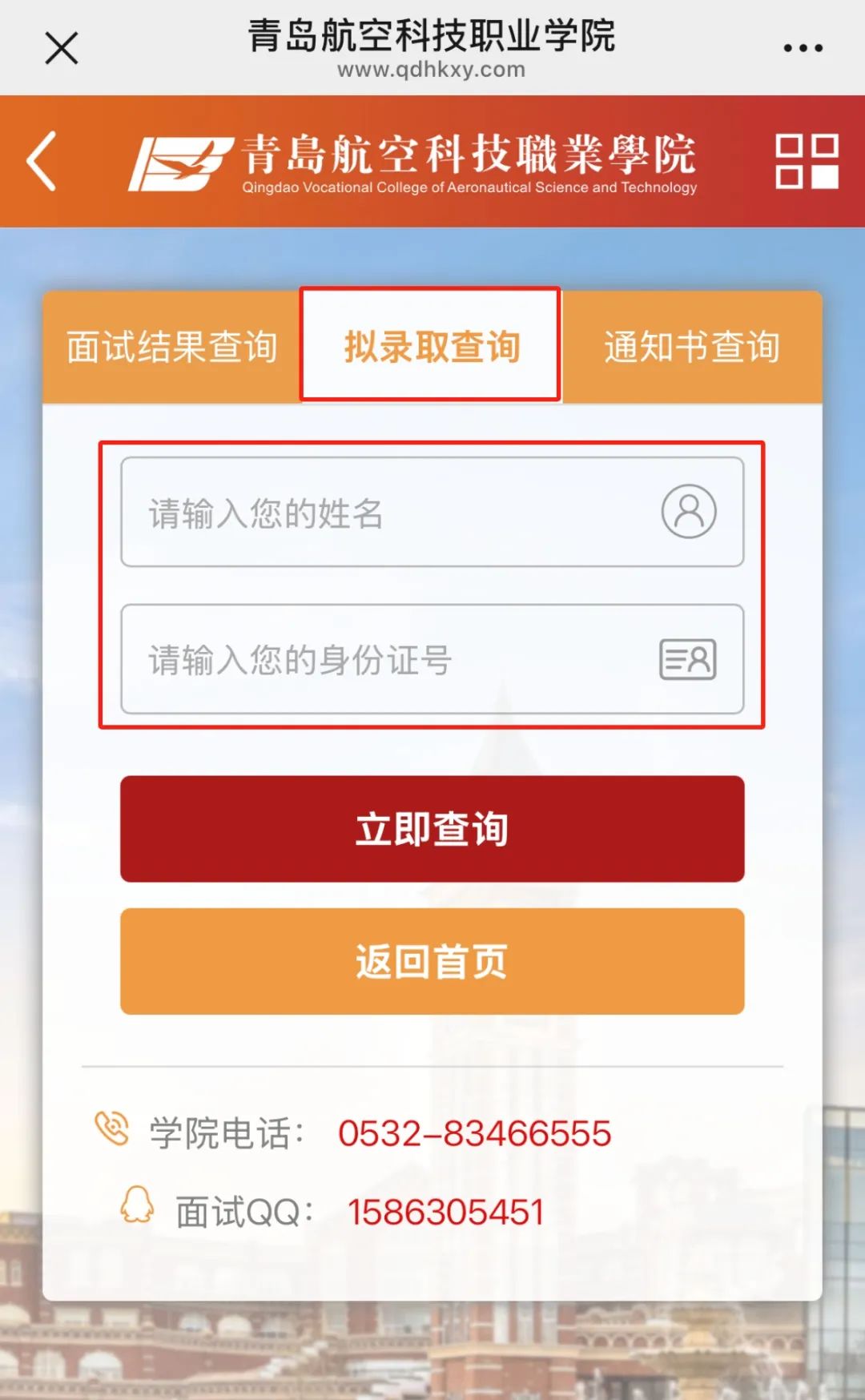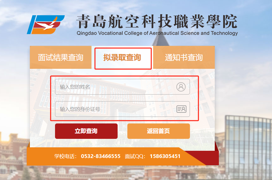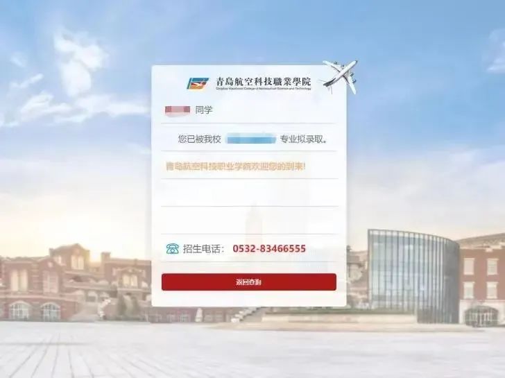 登录青岛航空科技职业学院官方网站:https://www.qdhkxy.com/query.html点击招生录取查询,输入姓名及身份证号码查询。
