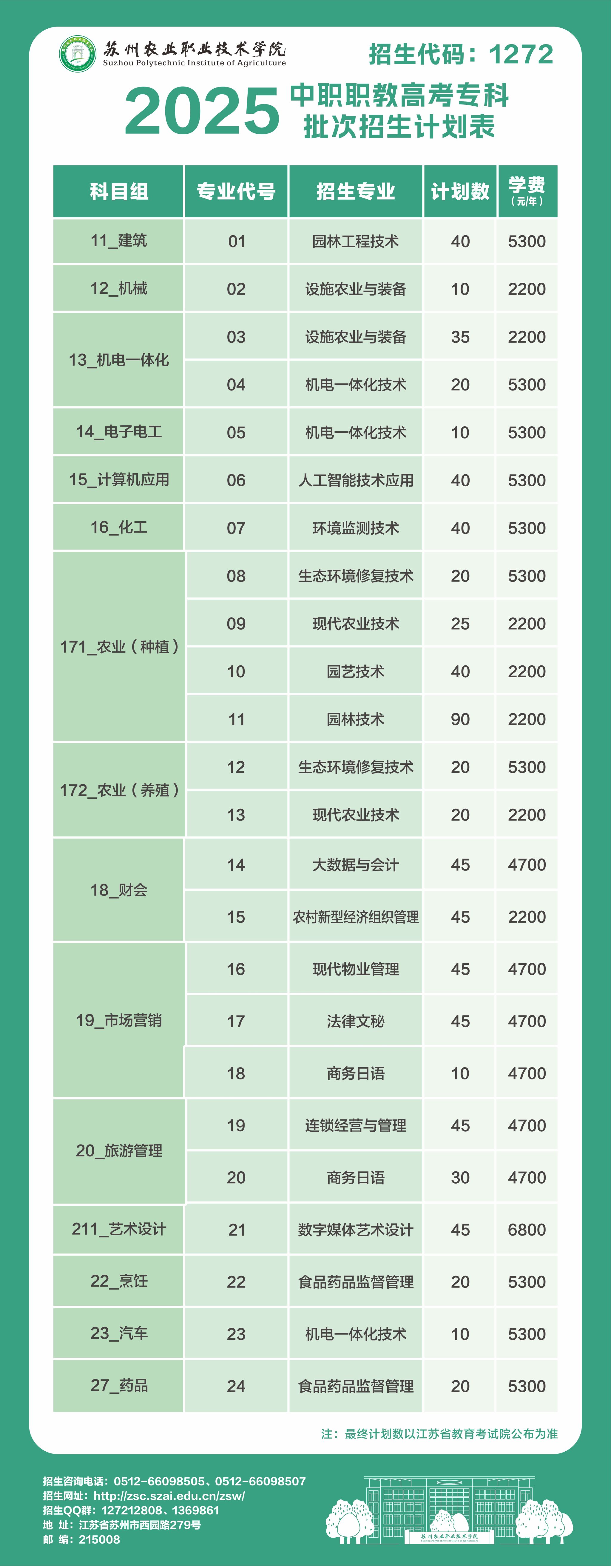 苏州农业职业技术学院2025年中职职教高考专科批次招生计划
