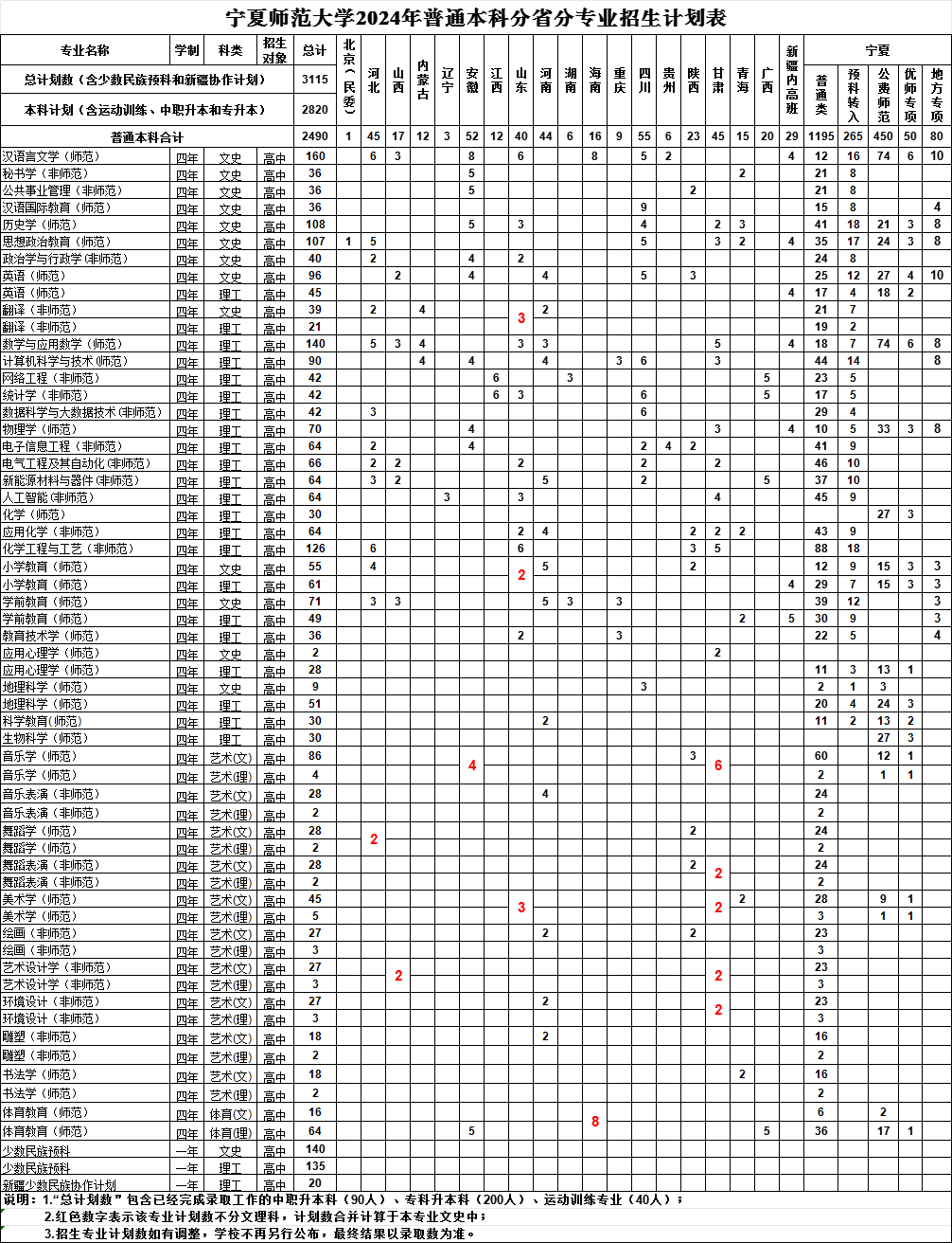 宁夏师范学院2024年普通本科分省分专业招生计划表