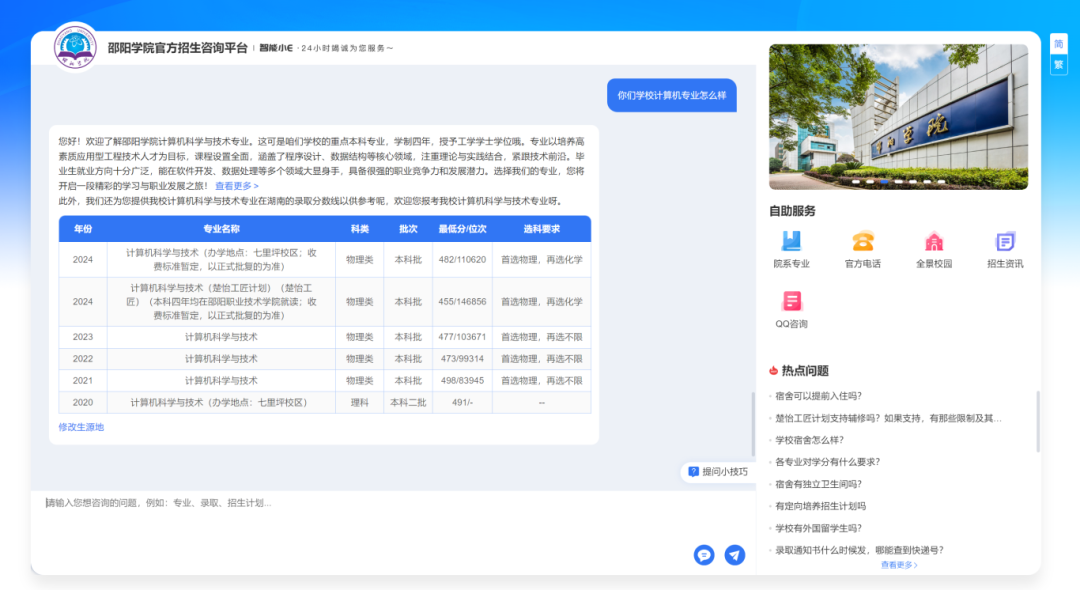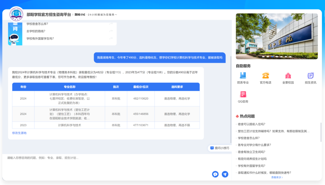 当你问“我是湖南考生,今年考了490分,选科是物化生,想学你们学校计算机科学与技术专业,能被录取吗”时,系统不仅能通过DeepSeek大模型技术精准识别你的咨询意图是:省份、分数、选科要求、录取分数,还会结合历年录取数据,为你提供精准的回复!