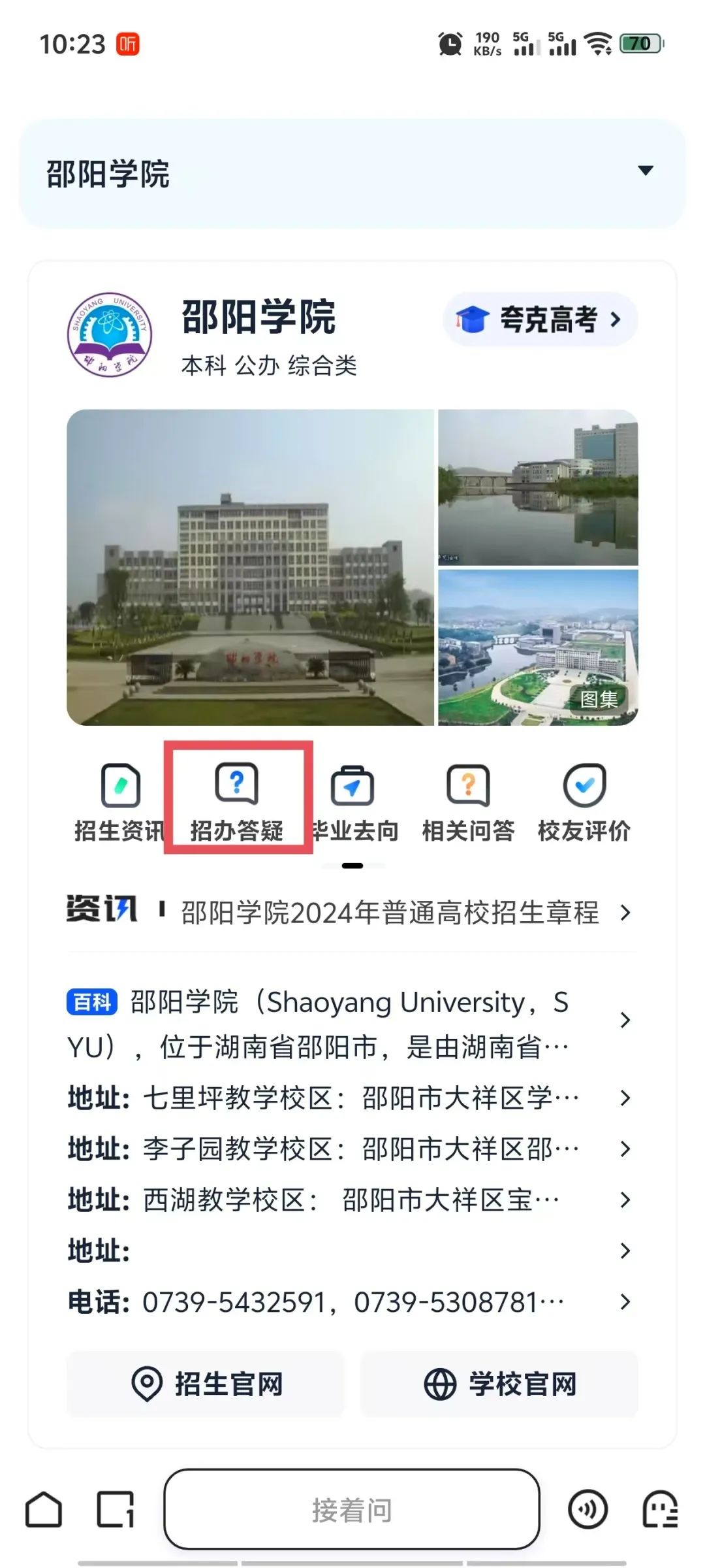 进入“邵阳学院招生办公室”小程序主页面,点击右侧小图标,跳转至问答页即可进行提问。
