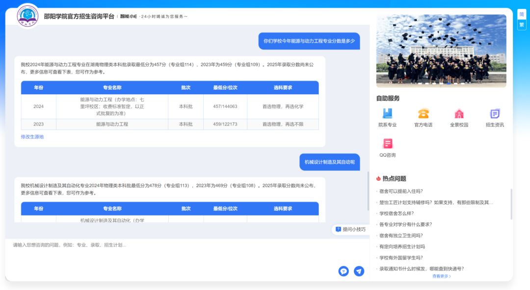 当你问“你们学校今年能源与动力工程专业分数是多少?”“机械设计制造及其自动呢?”系统能凭借DeepSeek大模型的逻辑分析能力,记住对话上下文信息,准确识别考生的咨询意图与第一轮对话中的“专业分数”相关,为你提供更连贯、更精准的回答!