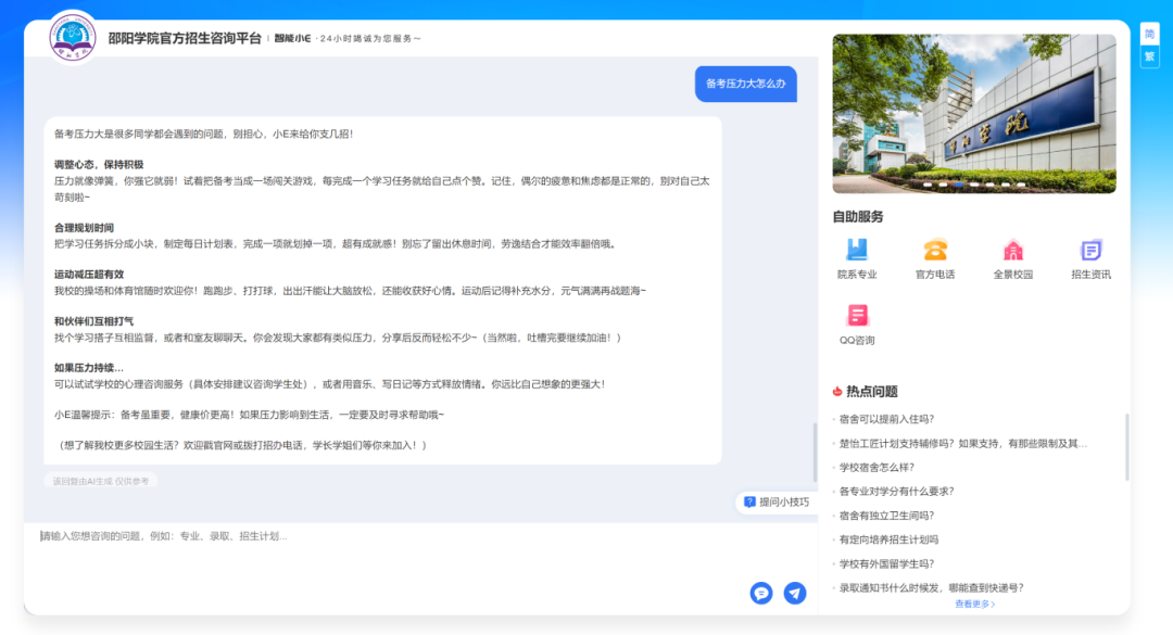 系统基于DeepSeek的强大技术,能精准识别你的提问意图,无论是复杂的志愿填报问题、还是关于校园生活的小疑惑,系统都能快速理解,给出精准答案!
