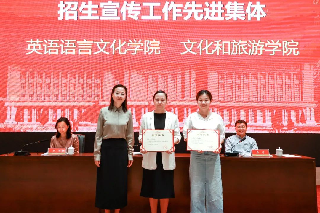 英文学院、文旅学院分别作招生宣传工作先进集体发言,教育学院教师叶丽霞、西语学院辅导员李奇贵分别作招生宣传工作先进个人代表发言。教育学院和商学院、创业学院分别作就业工作交流发言。