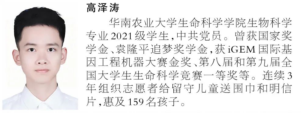 他立志科研、追求真理的理想愈发坚定在学习过程中了解到细菌性疾病对农作物产量至关重要他主动申请加入学院创新创业团队跟随老师研究水稻致病菌检测的便捷可视化方法为了真正做到学以致用高泽涛经常在实验室奋战至深夜在省级比赛中担任项目第一负责人