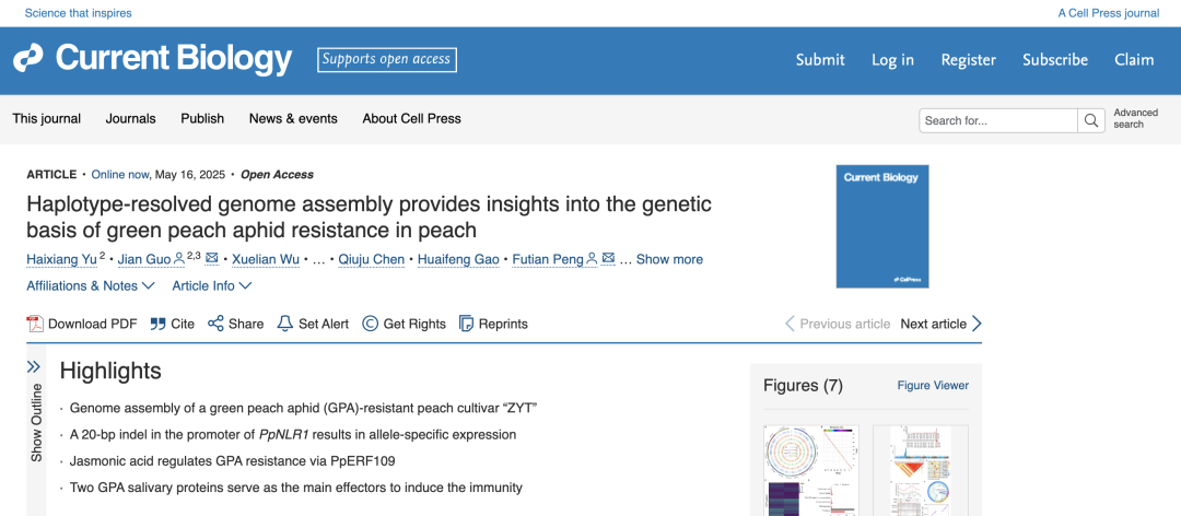 北京时间2025年5月16日,山东农业大学园艺科学与工程学院彭福田教授研究团队在国际著名学术期刊《当代生物学》(Current Biology)在线发表了题为“Haplotype-resolved genome assembly provides insights into the genetic basis of green peach aphid resistance in peach”的重要研究成果。该研究成功破解了桃树抗蚜虫的基因密码,全面系统地揭示了桃树抵御蚜虫的分子机制,为抗蚜分子育种奠定重要理论基础,助力我国桃产业高质量发展。