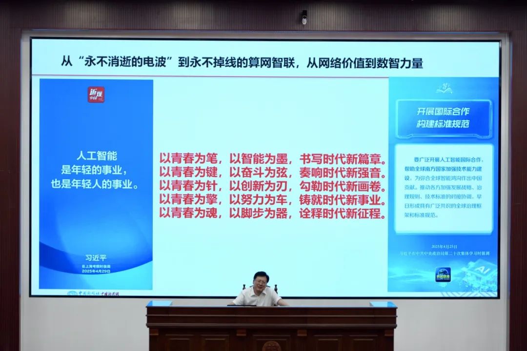 他讲到,当代青年应以青春为笔,以智能为墨,书写时代新篇章;以青春为键,以奋斗为弦,奏响时代新强音;以青春为针,以创新为刃,勾勒时代新画卷;以青春为擎,以努力为车,铸就时代新事业;以青春为魂,以脚步为器,诠释时代新征程,激励当代青年在时代浪潮下贡献自己的力量,以创新为炬,点亮未来之光。
