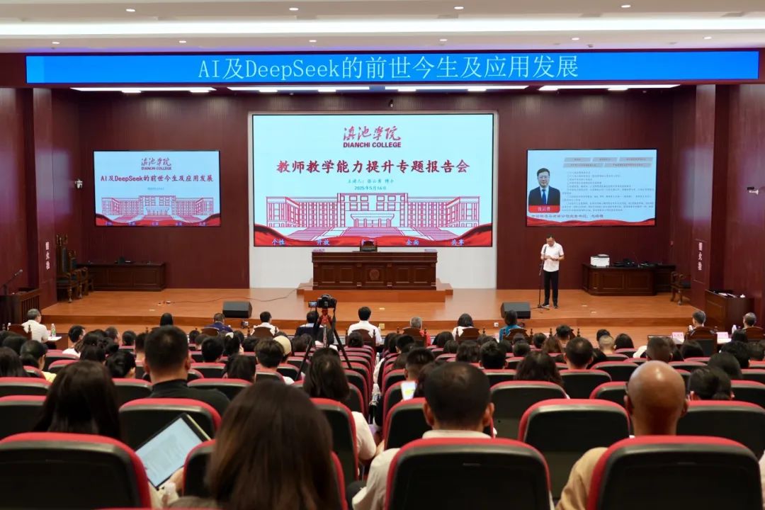 为深化人工智能与教育教学融合创新,全面提升教师教学能力水平,推动学校高质量发展,2025年5月16日下午,教师教学能力提升专题报告会在滇池学院杨林校区召开。学校特邀中国联通云南省公司党委书记、总经理张云勇作题为《AI及Deepseek的前世今生及应用发展》的报告。中国联通昆明分公司总经理朱瑜、中国联通云南省分公司公众客户事业部副经理王方,嵩明县教育体育局副局长李旺;滇池学院校领导,各职能部门、教辅部门、教学单位副科级以上管理人员,各教学单位三助理,中国联通嵩明县分公司员工代表和滇池学院师生代表参加报告会。会议由滇池学院副校长向晓明主持。