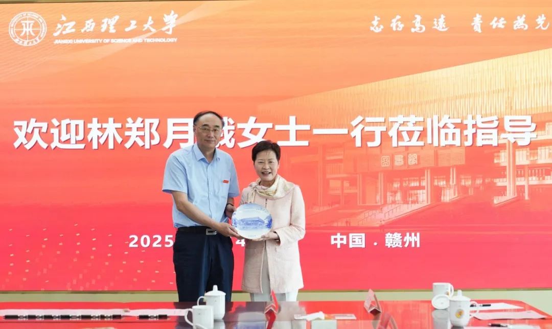 讲座前,林郑月娥女士一行来到校图书馆参观学校办学成果展,听取学校办学基本情况介绍,并与校领导班子开展见面交流会。会上,杨斌代表学校对林郑月娥女士的到来表示热烈欢迎,并表示,此次到访是一个良好的开端,将有效推动赣港两地高校、企业之间的合作交流。未来,全校师生将传承红色基因,主动融入粤港澳大湾区建设,为推进中国式现代化贡献江理力量。葛世荣代表学校向林郑月娥女士赠送纪念品。