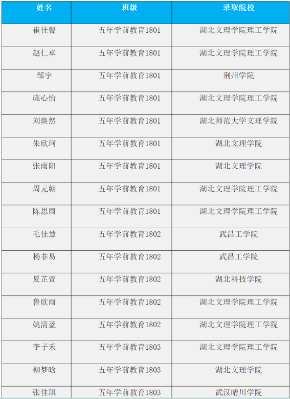 学前教育专业每年都有大量学生通过专升本考试,被湖北文理学院、荆楚理工学院、黄冈师范学院、汉江师范学院等多所普通本科院校录取。