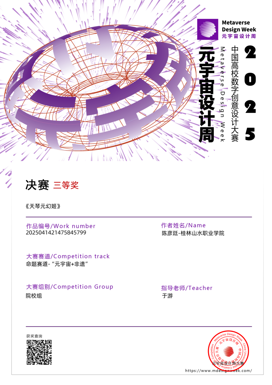 盛杰数字产业学院教师于游带领动漫制作技术专业的学生郭梦瑾和陈彦廷分别凭借作品《锦梦元行者》、《元宇魔方:开启虚拟新纪元》、《天琴元幻姬》斩获两项全国二等奖与一项三等奖,展现了学校数字创意与元宇宙设计领域的实力。