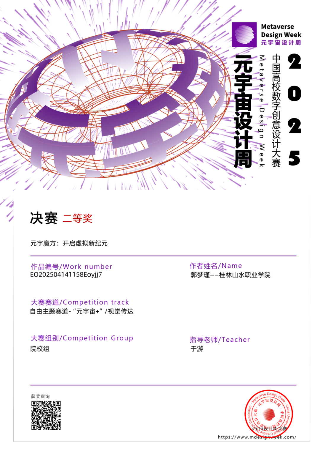 我将以这次获奖为新的起点,继续深化对元宇宙设计的研究和探索。有了这次的成功,我将时刻记住此刻的心情,鞭策自己努力上进,不辜负老师的期望与同学的陪伴。