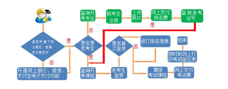 2.老考生报考时,使用准考证号登录网站报考(登陆密码为身份证号),完善考生信息,选择考试地点,填报课程,在线支付报考费用,在规定时间内完成报考过程。