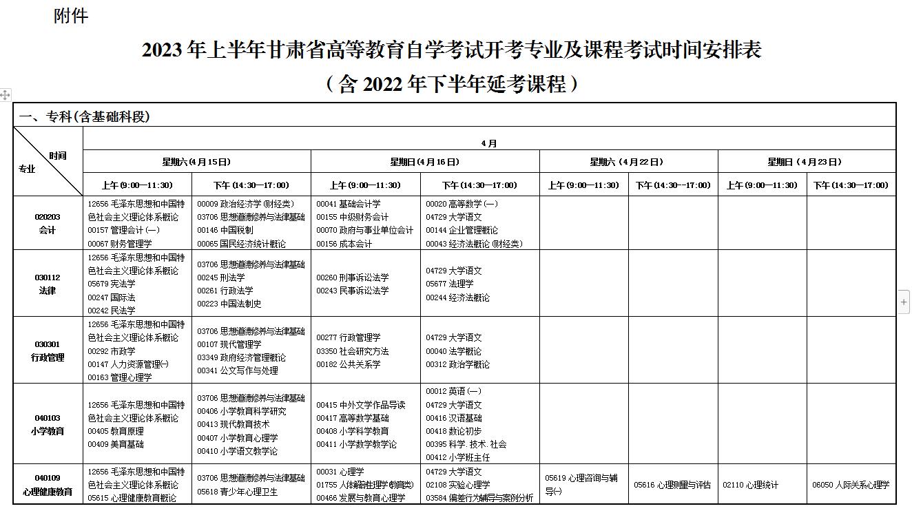 附件:2023年上半年甘肃省高等教育自学考试开考专业及课程考试时间安排(含2022年下半年延考课程)