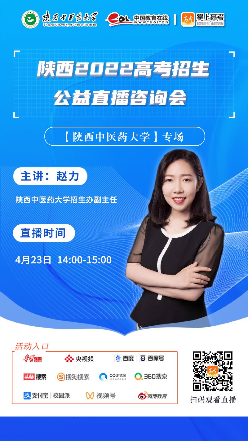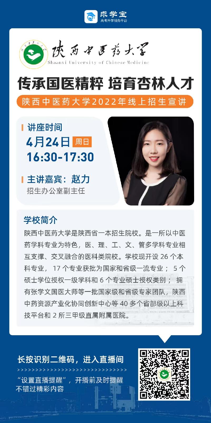 A A A 4月23日(本周六)14:00-15:004月24日(本周日)16:30-17:30陕西中医药招生办副主任 赵力2022高考直播咨询会为大家带来2022年招生政策的权威深度解读赶快扫描海报二维码预约直播吧↓↓↓