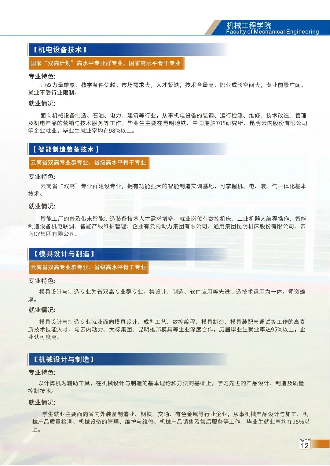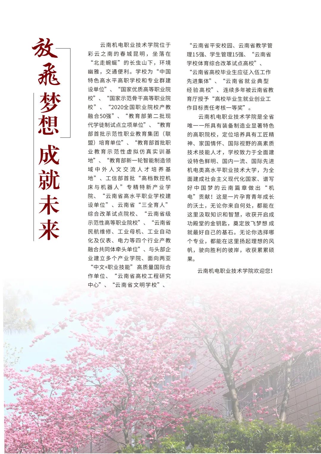 云南机电职业技术学院是从全国1400余所专科院校中遴选出的197所国家双高计划学校(专科院校中的“双一流”学校),立足机电,服务云南,面向全国,辐射南亚东南亚,办学特色鲜明,服务制造强国建设,社会声誉好,就业率高,欢迎你报考!