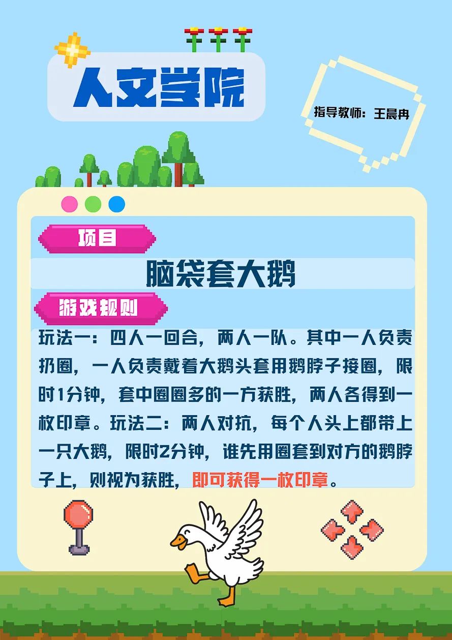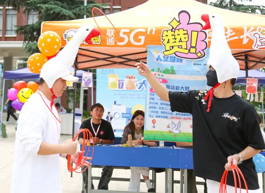 两人一队,一人负责扔圈,一人负责戴着大鹅头套接圈。同学们在欢声笑语中考验灵活性和平衡感,现场气氛超热烈。
