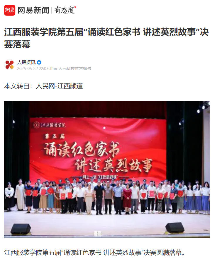 为厚植师生家国情怀,传承红色精神,激发新时代奋进的力量,5月20日,江西服装学院第五届“诵读红色家书 讲述英烈故事”决赛在体育馆表演厅举行。校党委副书记唐新强、党委组织部部长陈翠娥、党委宣传部部长沈新建、党委学工部部长邓良峰、党委保卫部部长鲍鹏,以及各学院党委(党总支)书记,思政课教师、辅导员、入党积极分子代表等400余名师生现场观摩了演出,近三千名师生通过视频号线上观看了现场直播。