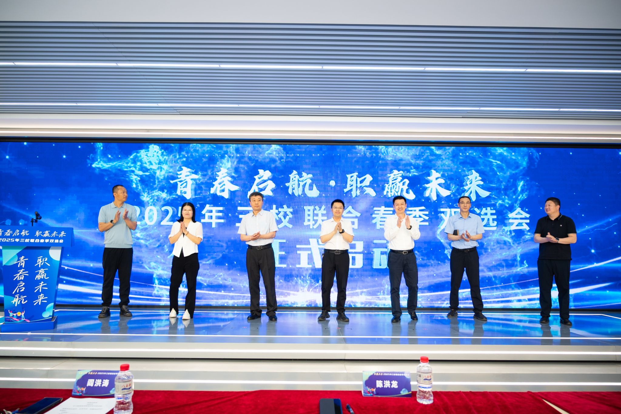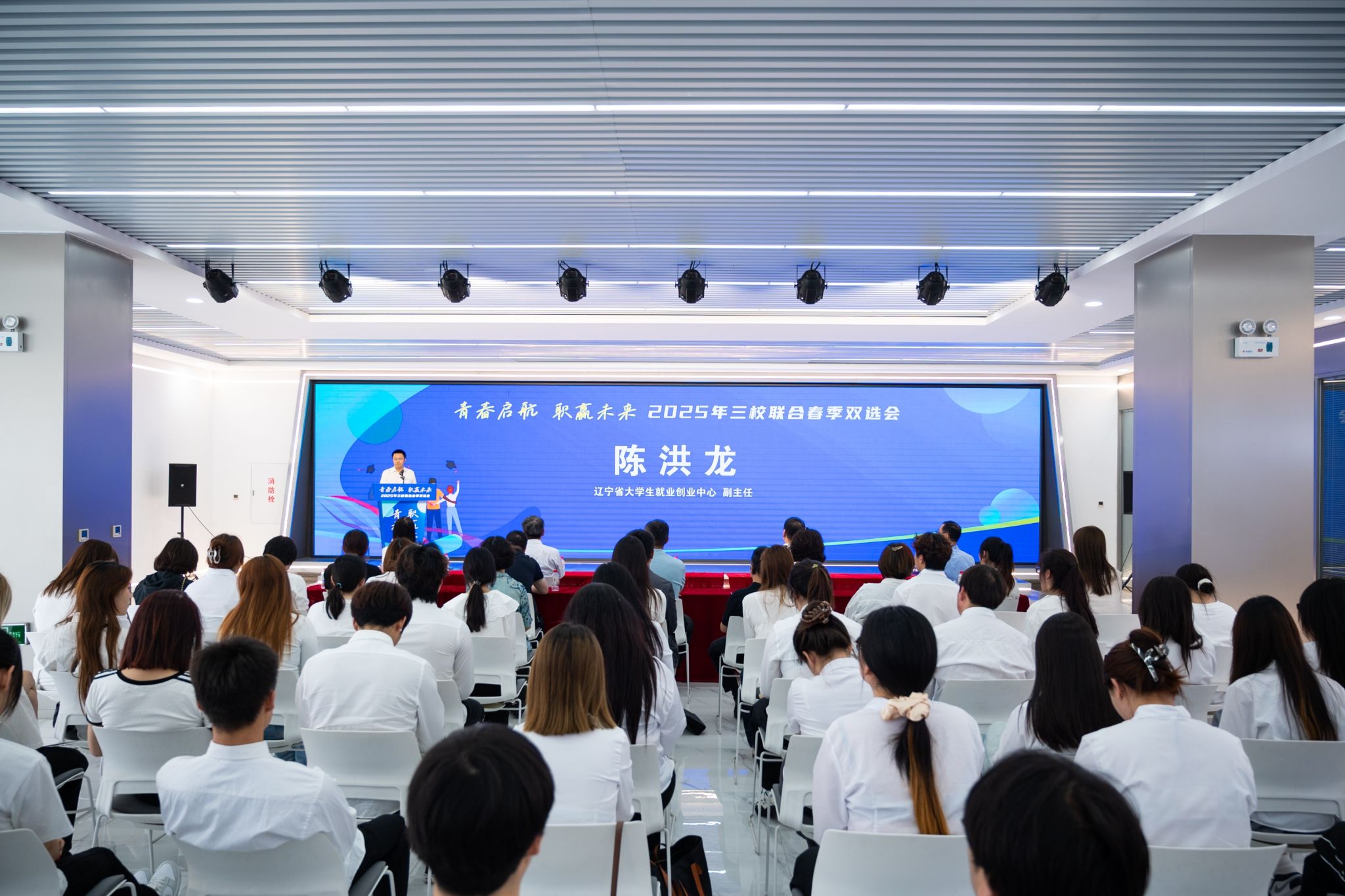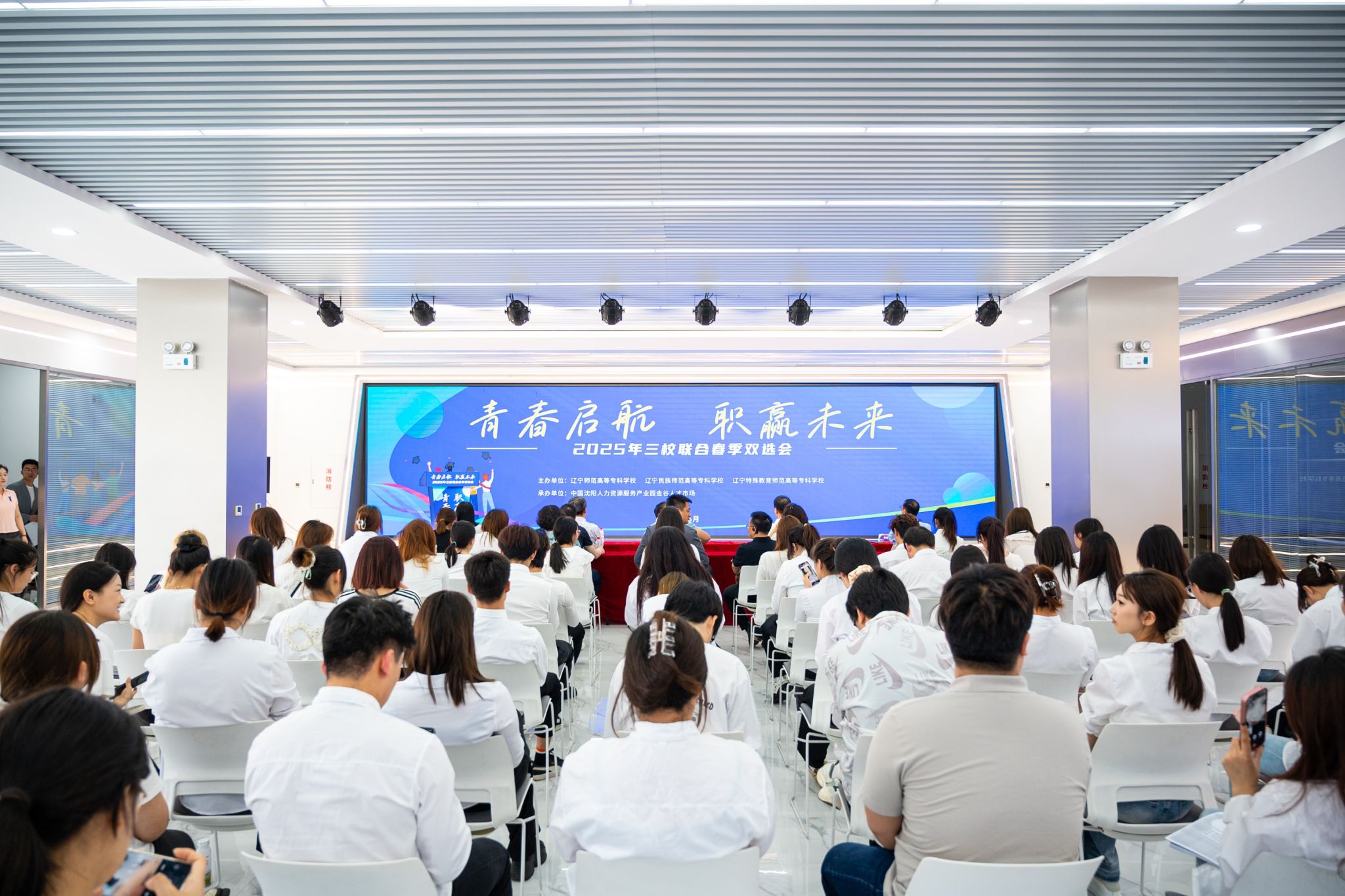 当日 13 时 30 分,双选会启动仪式正式拉开帷幕。辽宁省大学生就业创业中心副主任陈洪龙莅临开幕式并发表讲话,着重强调了高校毕业生就业工作对社会稳定与发展的重要性,充分肯定了三校在就业工作上的积极作为,同时期望本次双选会能切实为毕业生和企业搭建优质平台。随后由辽宁特殊教育师范高等专科学校党委书记阎洪涛在仪式上致辞,由我校推荐的企业代表分享了企业发展规划与人才需求,展现出对吸纳优秀毕业生的强烈意愿,接下来辽宁师范高等专科学校学生代表发言。最后,各校领导共同登台,宣布双选会正式开启。