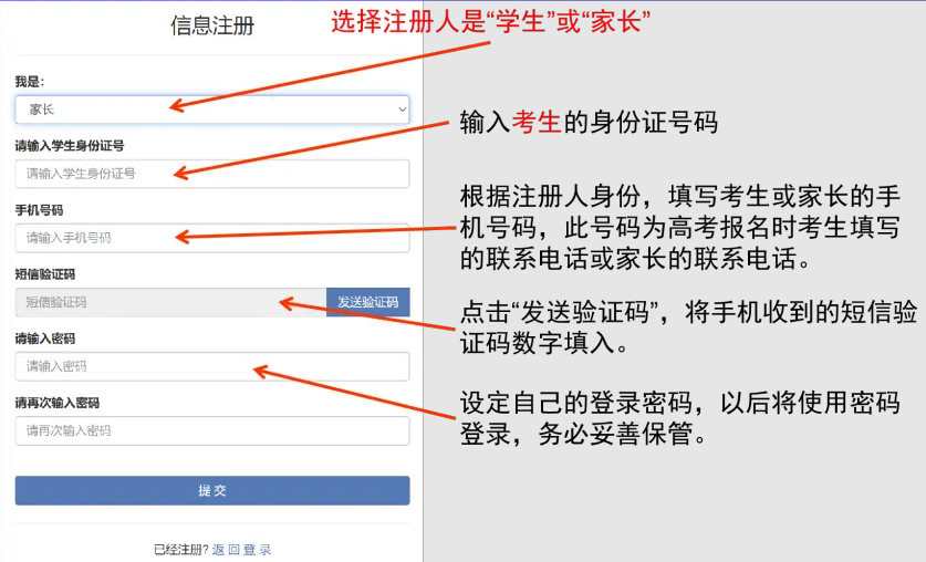 考生或家长注册登录时会使用考生高考报名时填报的信息和电话号码进行身份验证。
