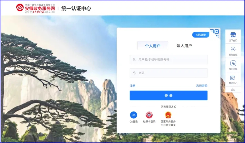 点击“省政务网账号登录”后,系统会跳转至安徽政务服务网登录界面: