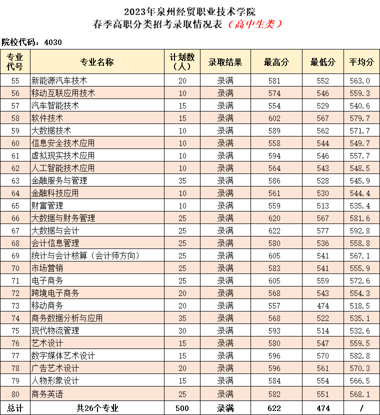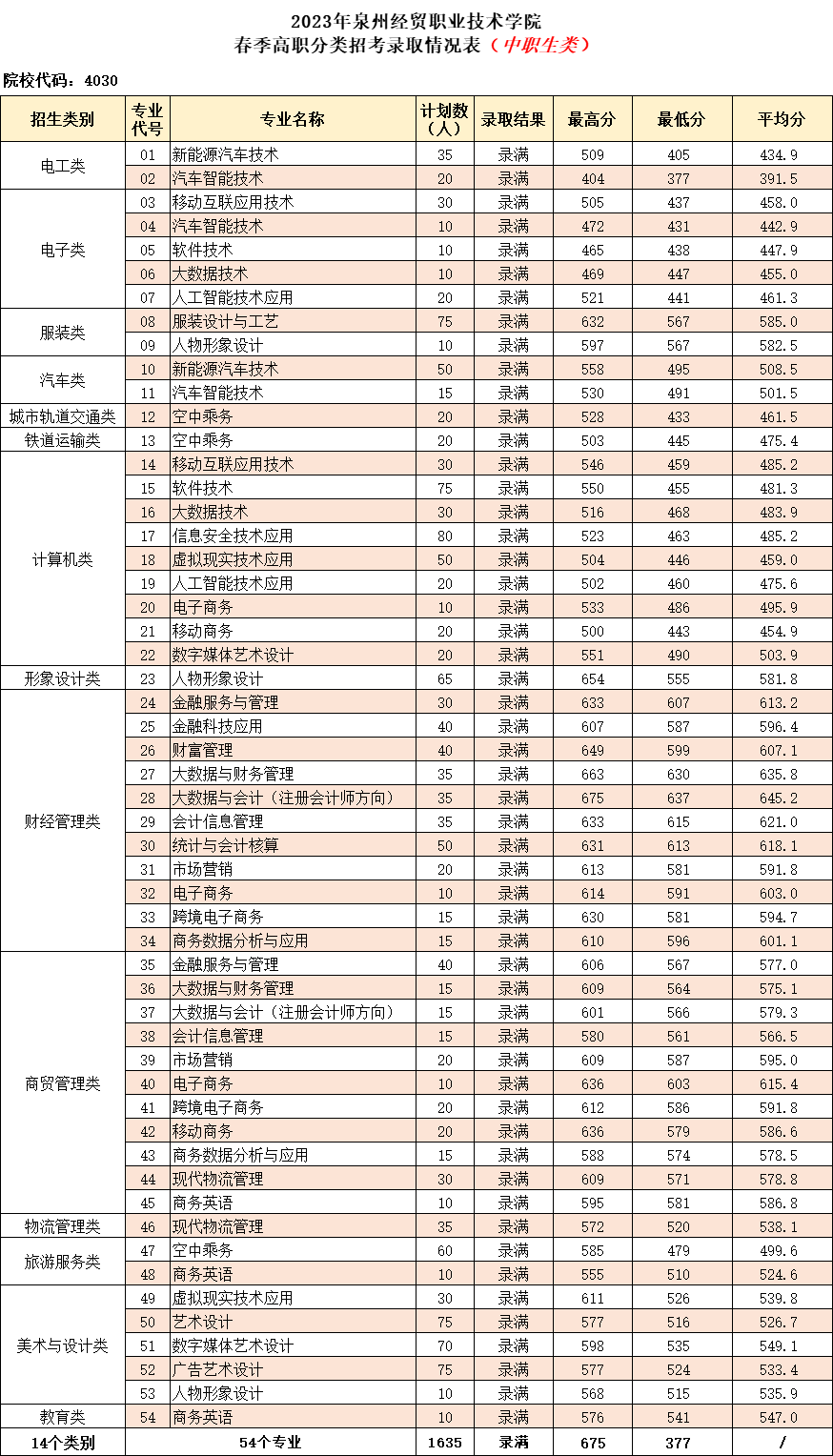 泉州经贸学院2023年高职分类考试分类分专业录取情况表
