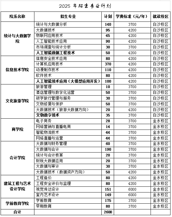 2.学校录取新生的基本条件:(1)符合教育部颁发的《2025年普通高等学校招生工作规定》的报名条件;(2)考生高考文化总成绩达到省划定的录取控制分数线,按照“分数优先、遵循志愿”的原则,学校对所有进档考生,根据本人专业志愿及招生计划,依分数从高分到低分排序,在专业招生计划内择优录取;当考生投档成绩(含小数部分)相同时,依次按照语文、数学、外语单科成绩由高到低排序,确定录取专业;如考生所填志愿都无法满足,服从专业调剂者,根据考生成绩在允许调剂的专业范围内调剂录取,不服从专业调剂者,做退档处理。(3)外语语种要求:教学为英语教学,没有其它小语种教学。(4)艺术类(美术类)专业考生录取规则:以河南省教育考试院到档数据为招生依据,按照排序成绩从高到低录取。投档排序成绩计算公式为:综合成绩=高考文化总成绩×0.5+专业省统考成绩×1.25。当考生综合成绩相同时,先按美术类省级统考成绩排序,如仍相同,再按照普通类同分排序办法,由高到低依次排序,确定录取专业。(5)招生专业的选考科目要求:所有专业首选历史、物理科目均可填报,再选科目要求为不提再选科目要求。