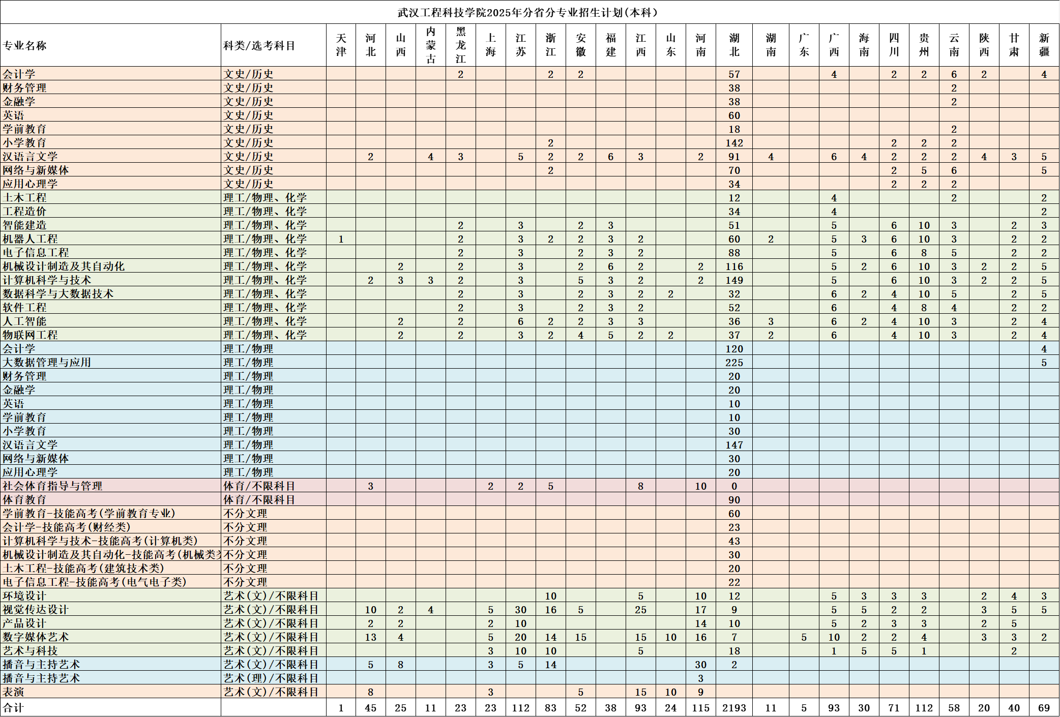 武汉工程科技学院2025年分省分专业招生计划(本科)