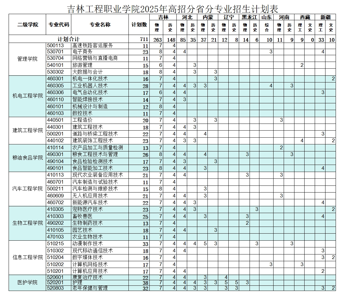 吉林工程职业学院2025年高招分省分专业招生计划