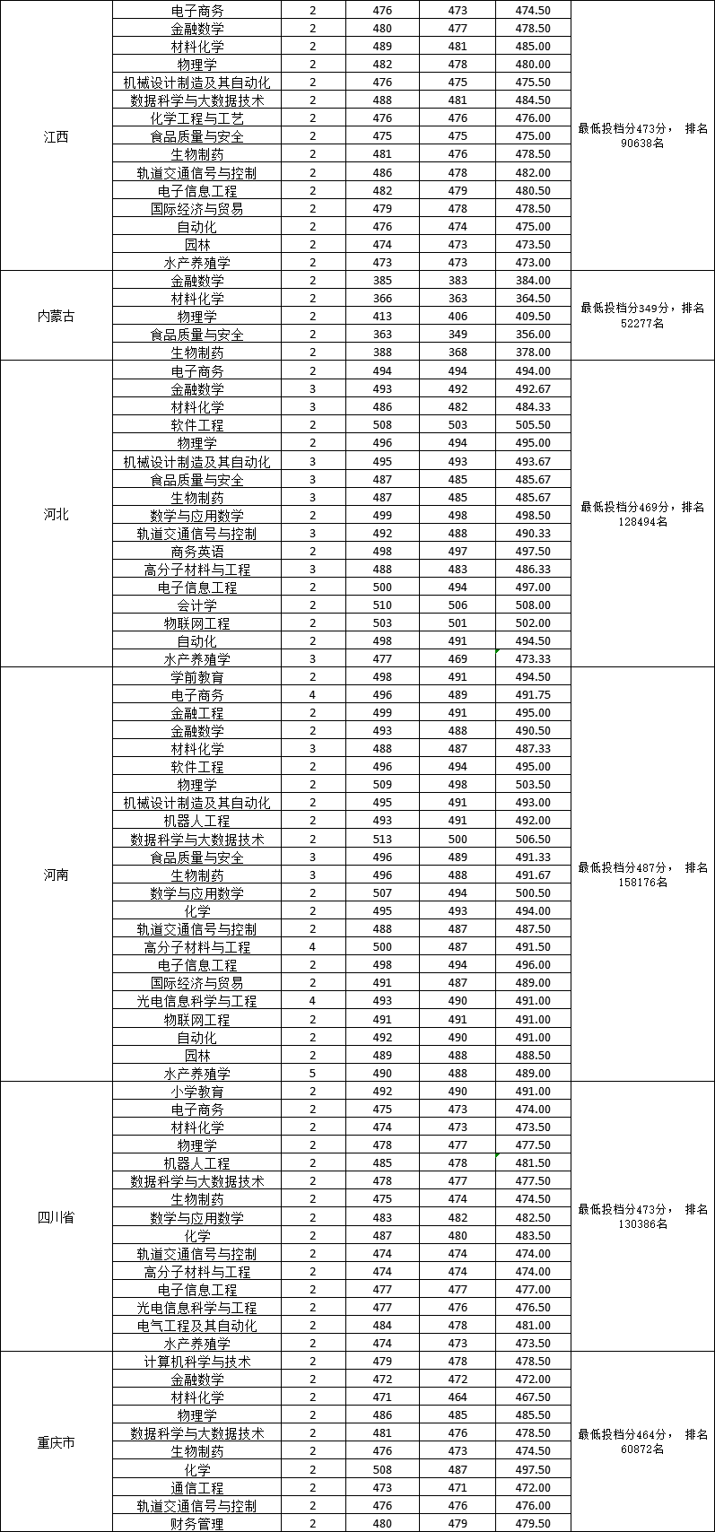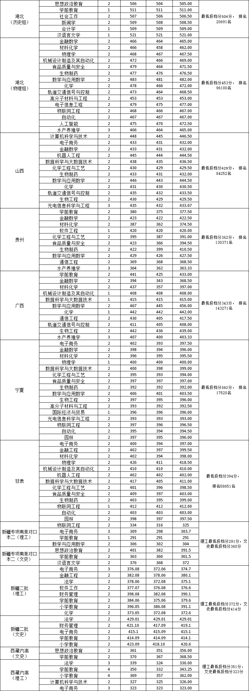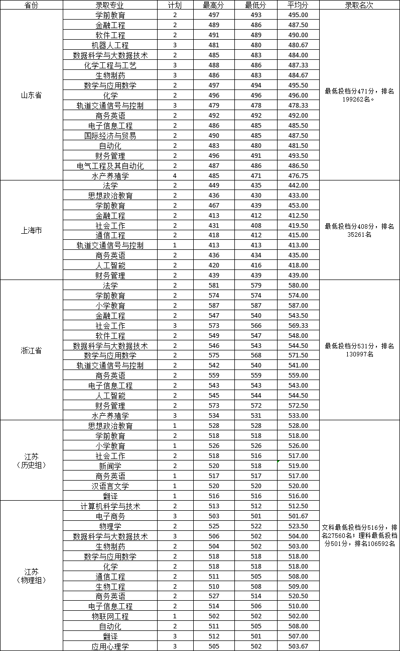 淮南师范学院2022年省外普通文理各专业录取情况