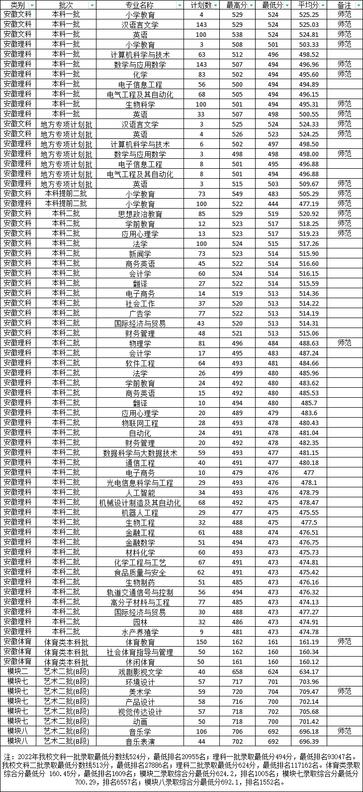 淮南师范学院2022年安徽省内普通文理(含艺体类)各专业录取情况