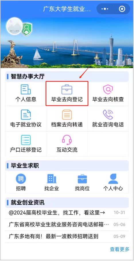 请全体毕业班同学在6月8日前登录“广东大学生就业创业”小程序的“毕业去向登记”模块,填报本人毕业去向。
