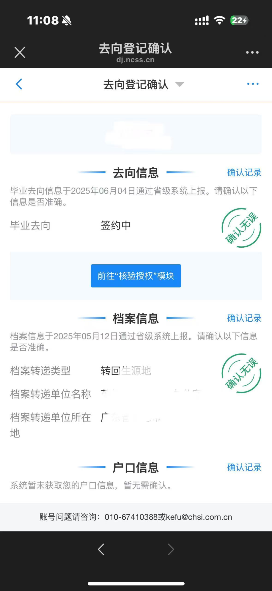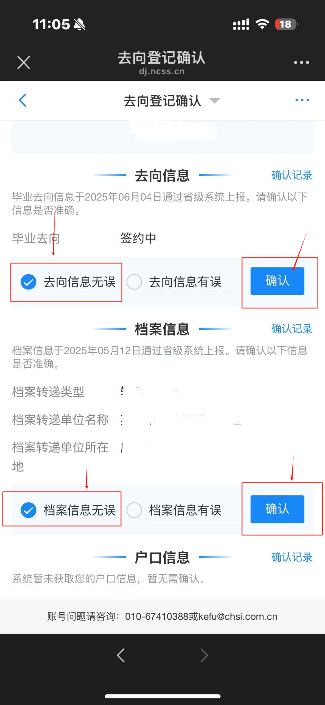 1.若信息无误,选择“去向信息”无误和“档案信息”无误,分别点击“确认”提交。