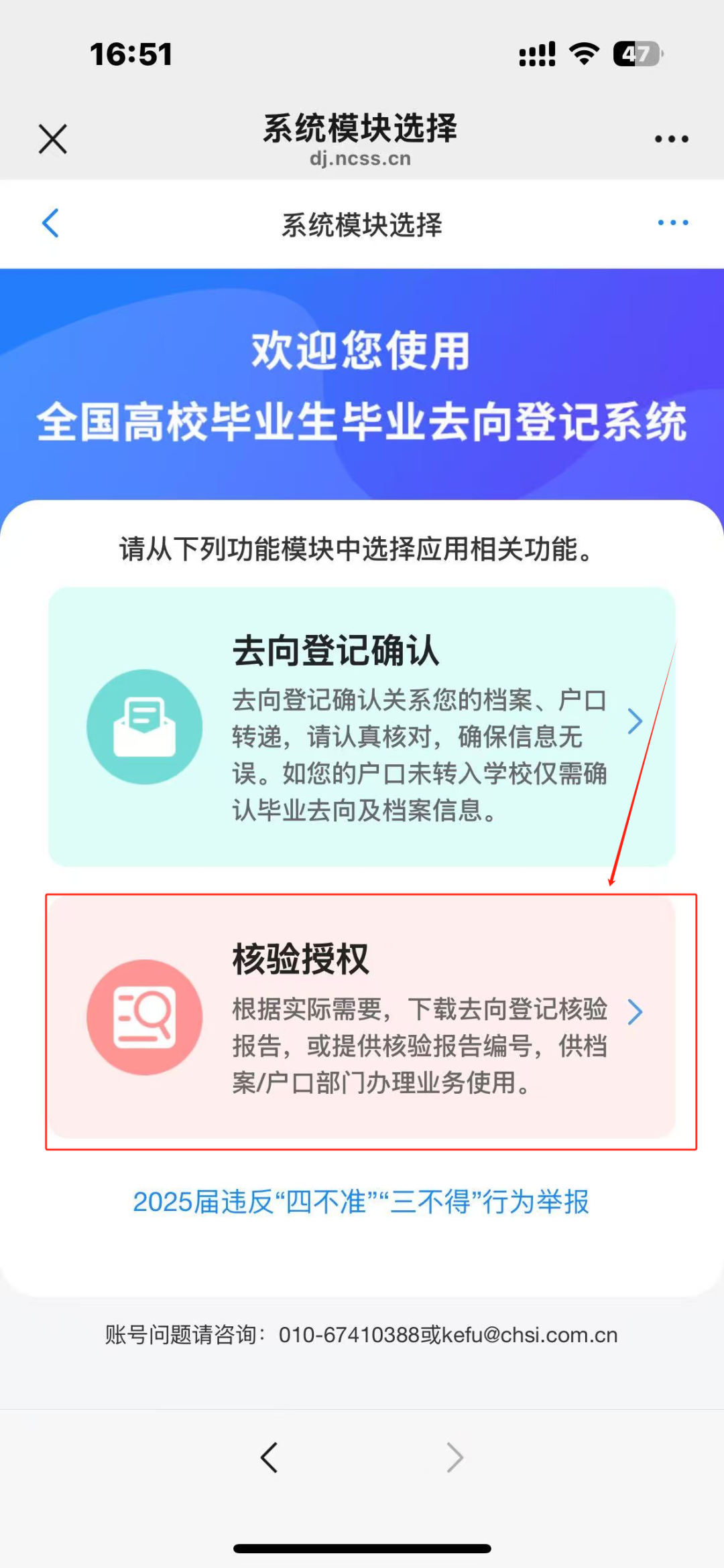 “核验授权”用于授权档案和户籍接收管理部门查询核验本人的去向登记信息,供相关部门办理转档、落户使用。