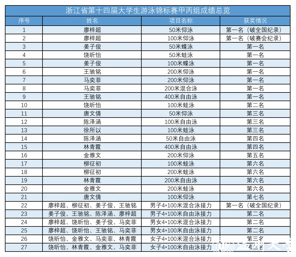 据悉,男子丙组4×100米混合泳接力队由体育与健康学院廖梓超、柳征初、姜子俊、王驰铭四位同学组成,个人单项50米仰泳和100米仰泳的纪录由廖梓超同学刷新。我校11名参赛健儿在各比赛项目中有27个项目收获好成绩。