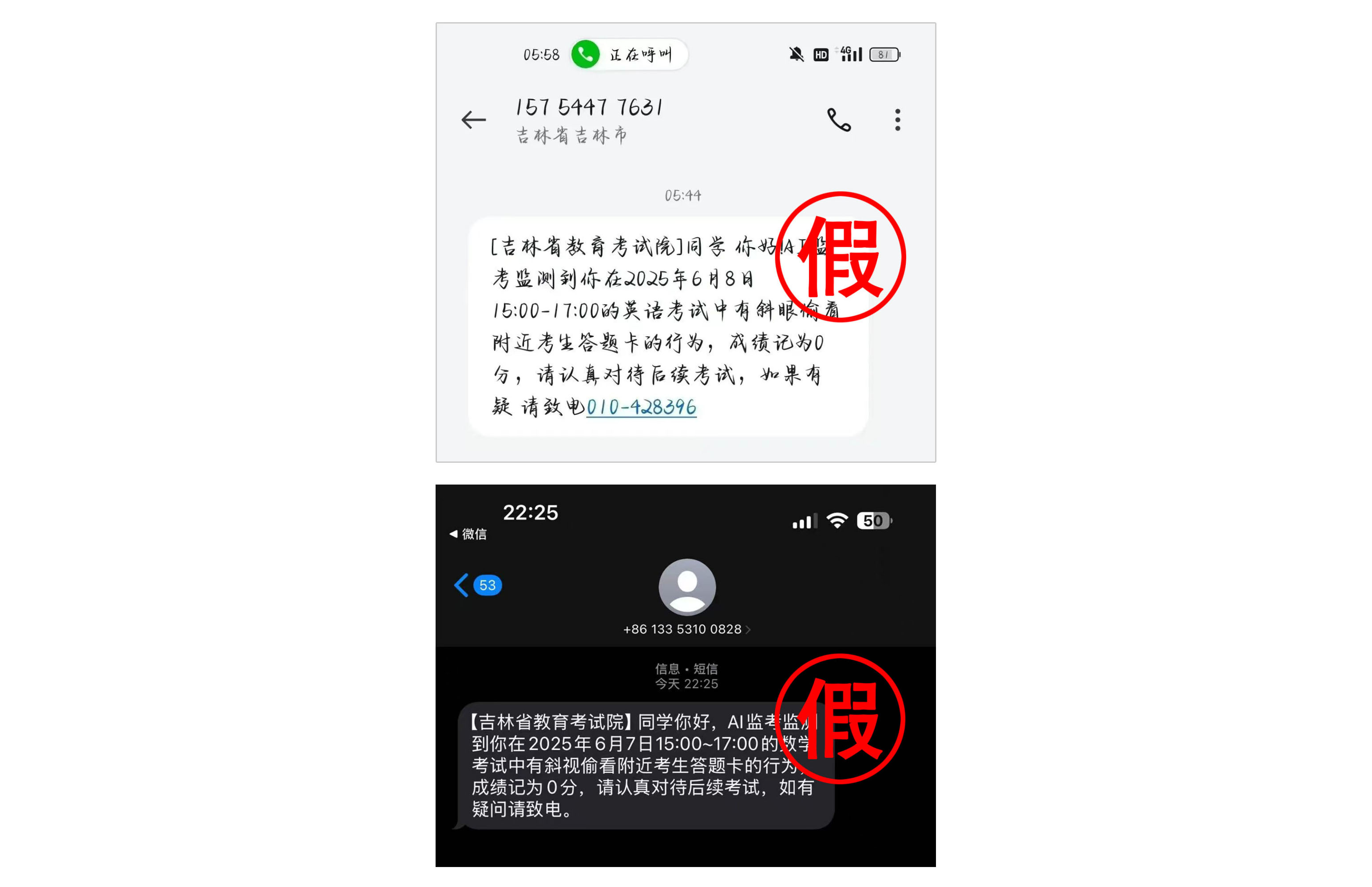 近日,部分高考考生收到所谓“吉林省教育考试院”的短信,称在考试中被AI监考发现其有作弊行为,成绩记为0分。吉林省教育考试院在此郑重提醒:这是典型的短信诈骗。教育主管部门和招考机构不会向考生发送此类消息。请各位考生及家长注意保管个人信息,谨防上当受骗。