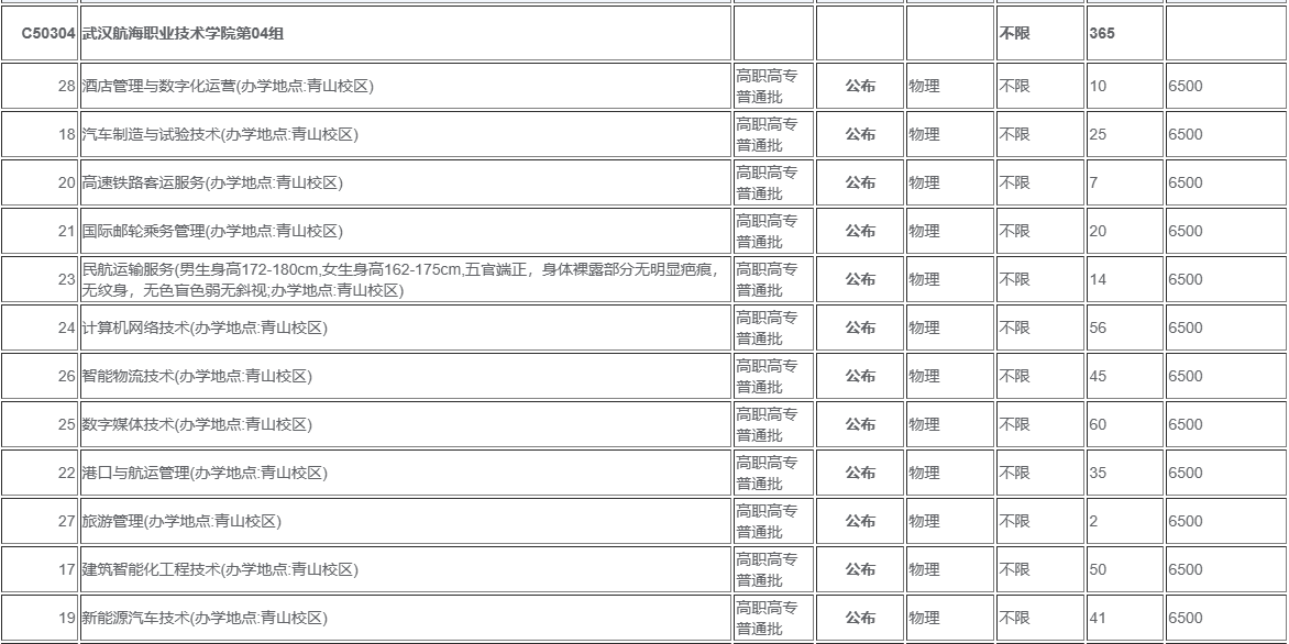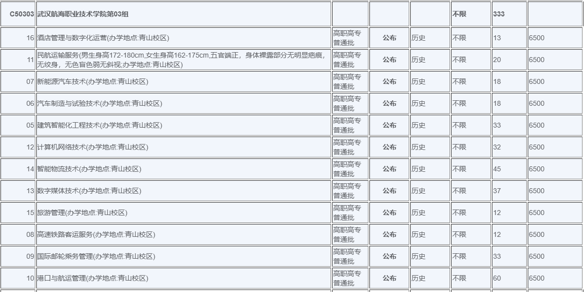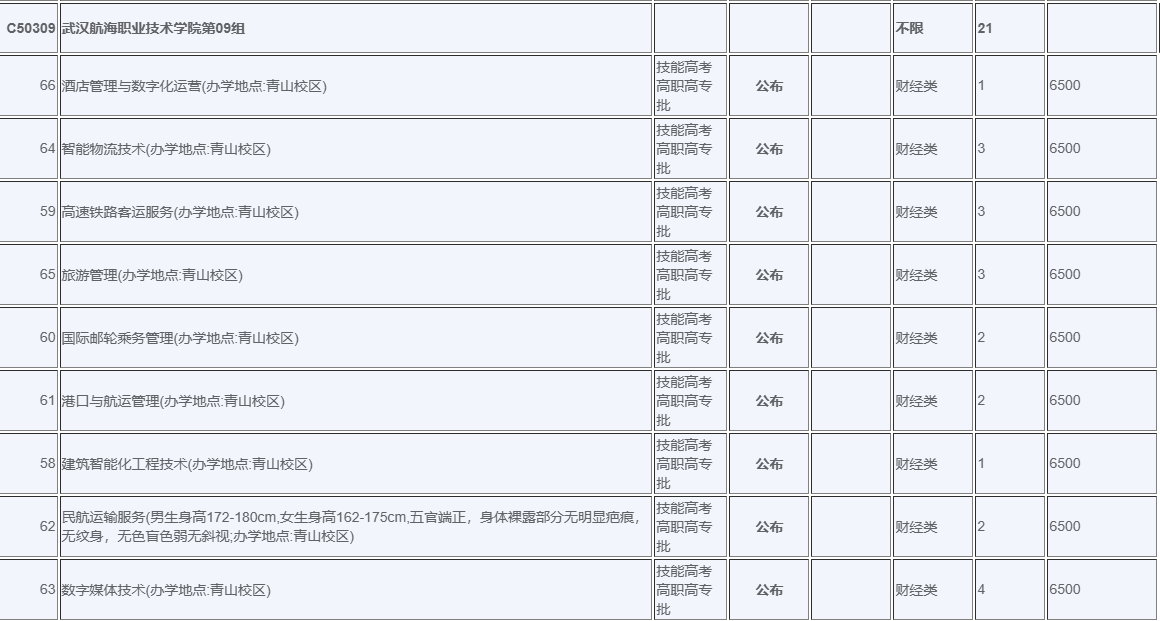 | 47 | 民航运输服务(男生身高172-180cm,女生身高162-175cm,五官端正,身体裸露部分无明显疤痕,无纹身,无色盲色弱无斜视;办学地点:青山校区) | 技能高考高职高专批 | 公布 | 计算机类 | 1 | 6500 |